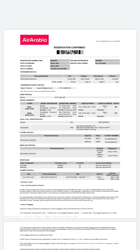 In order for me to understand the Air Arabia Refund Policy I had approached the Air Arabia Customer Care India contact number on which the supporting executive Mr Aleem has advised me about the usage of this travel voucher issued against my return Ticket on or before 28-03-2023. He had also explained to me that after booking a new travel ticket, if i wanna change it to any of my family members' names, it can be done at a cost of AED 350. He had helped me with an official Air Arabia Contact number +[protected] together with this email address. But since my job is no more, hence i have no reason to travel back to Kurdistan.Hence I request for a refund claim of my Air Ticket AED 1290.
