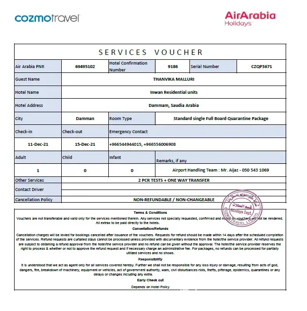 Bad experience with air arabia I lost my 4 days salary as well as I spent money double pcr test for family,taxi,hotel, please compensate everything ASAP. If you I will share the documents.