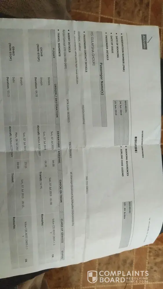 I gulafsha ghouri travel through air arabia on 19-20 september from delhi to bishkek via sharjah from flight no. G9464 and G9347