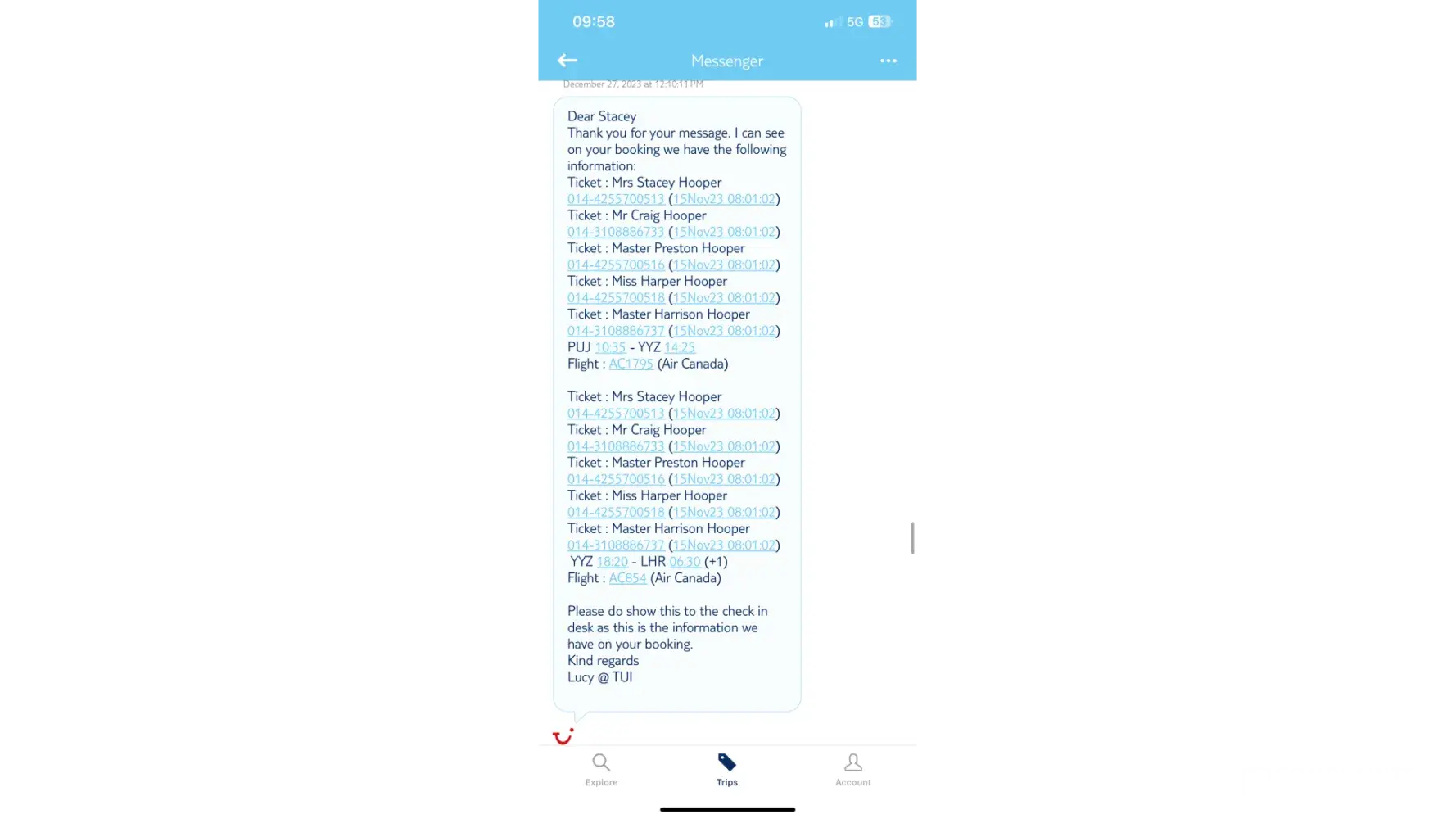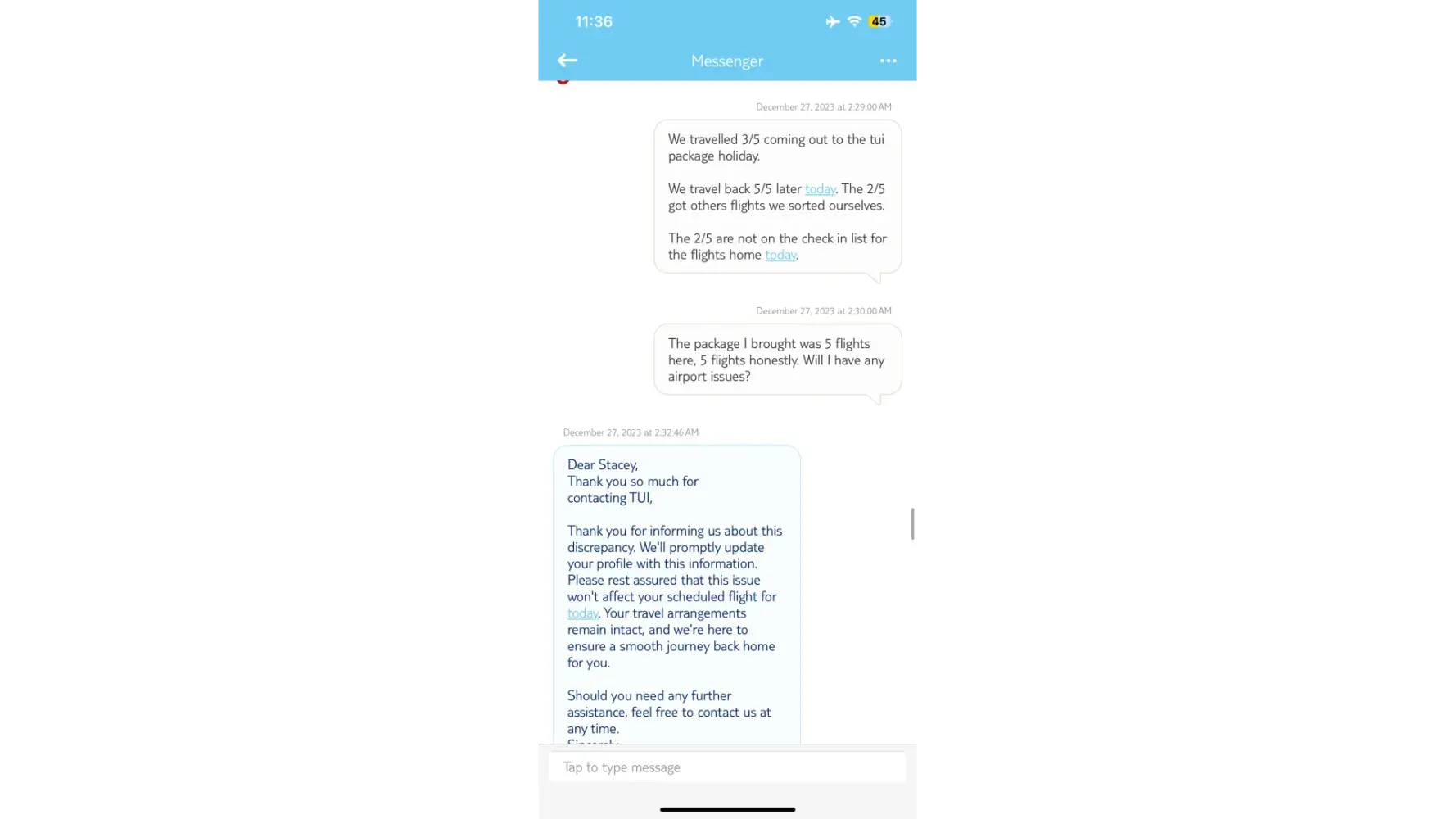 27/12/2023 - The day we are due after the worst holiday we have ever had and Christmas ruined, I contacted TUI to re-explain the situation clearly on the messenger chat to confirm the travel plans for going home would be straight forward (screenshot attached) I was advised rest assured that this issue will not affect your scheduled flight by TUI in writing (again see attached).