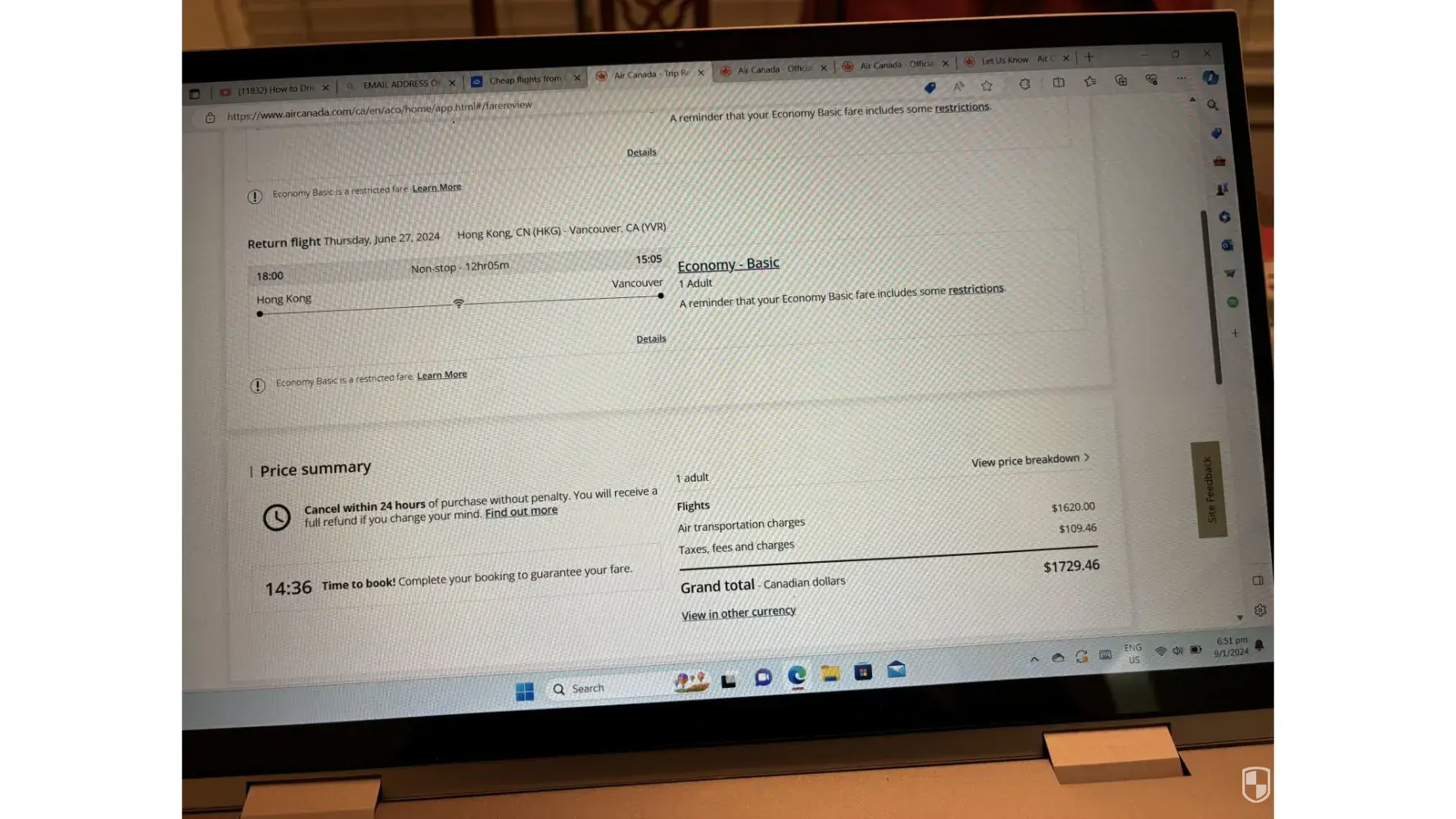 We have observed that the air transportation charges for the above two tickets have been reduced to C$1,620 and C$1,880.00 respectively as of January 7, 2024. Please see the attachments 1 and 2 for details. They even appear the same position as at the time of writing this email. This translates into an over-charge of (C$2,040.60 + C$2,300.60 - C$1,620.00 - C$1,880), i.e., C$841.20.