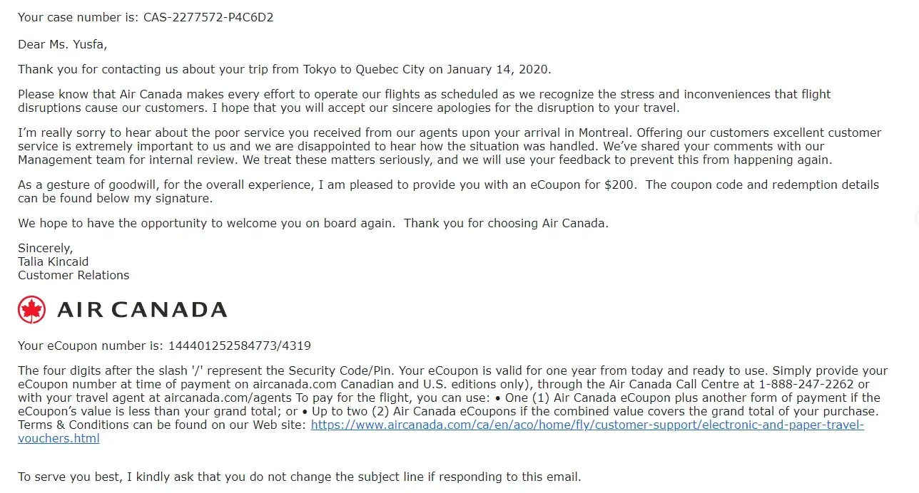 en tout cas d avoir 2 problemes a la meme station Narrita ca cree une question chez le client si les employés d' Air canada manquent de professionnalisme ou une orientation de service à la clientèle.
