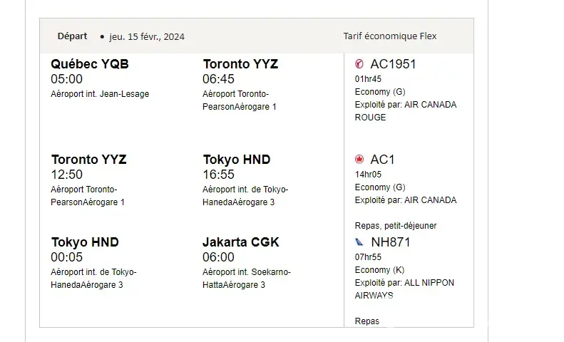 en allant le 16 janvier 2024 vol AC5 ,1:05 PM de montreal A Tokyo .