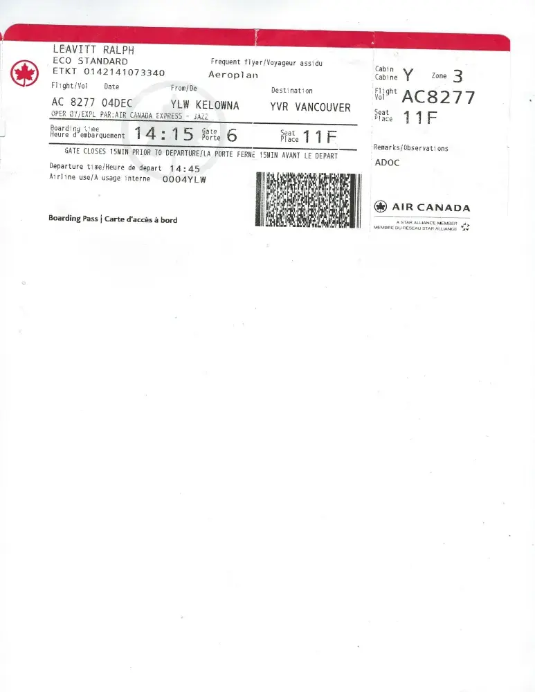 On my original booking I was sceduled to take Flt 8277 from Kelowna to Vancouver on Dec. 4th