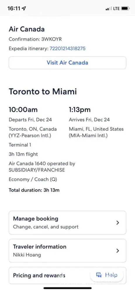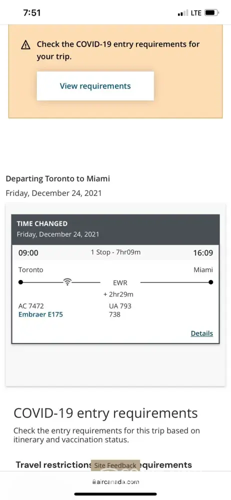 My friend purchased a direct (3 hour) ticket for me from Expedia to fly on Dec 24, 2021, to Miami on Air Canada flight 1640 from Toronto at 10am arriving in Miami at 1:3pm, and got a notification telling me the direct flight was cancelled and I was put on a connecting from Toronto to Newark to Miami which would take (7hrs).