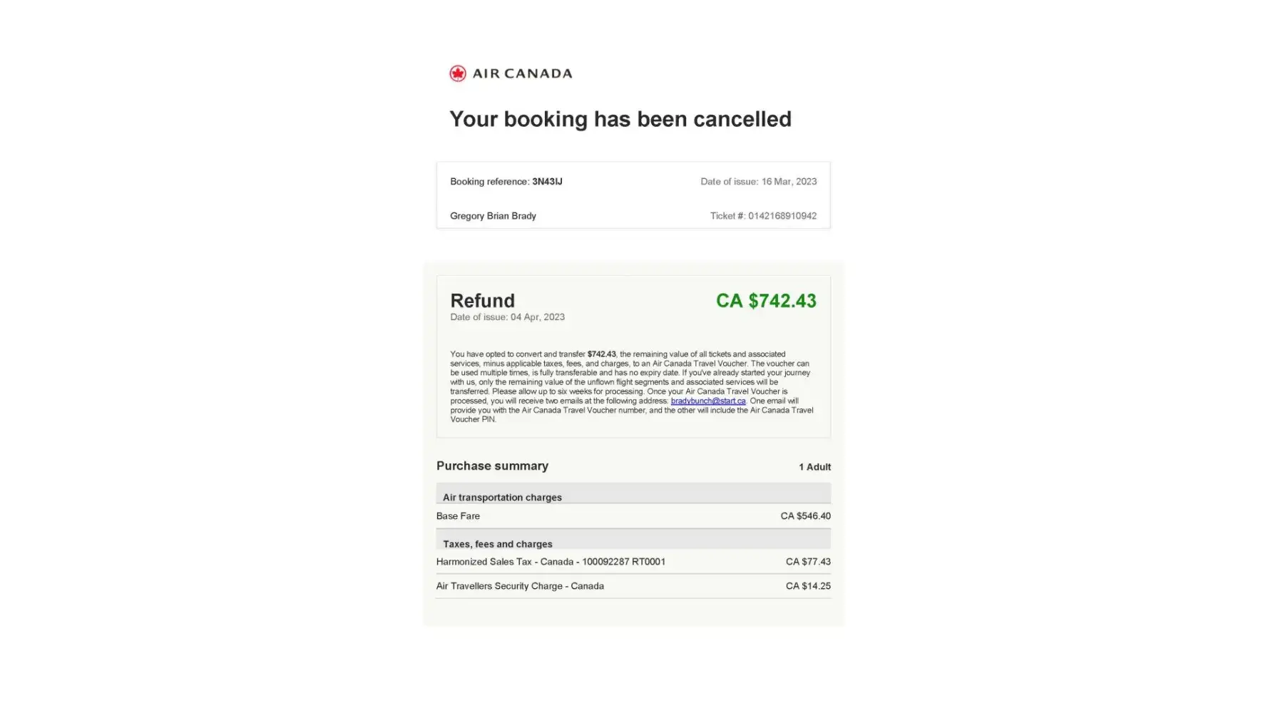Received an email for Refund dated on April 4, 2023; never received my two emails for the Air Canada Voucher number and the Air Canada PIN number in order to access my refund voucher. This should have been processed a long time ago and I need to book a flight for November 11th to November 15th, 2023 to attend any upcoming scheduled conference. And would lie to use my refund instead of purchasing through corporate payment.