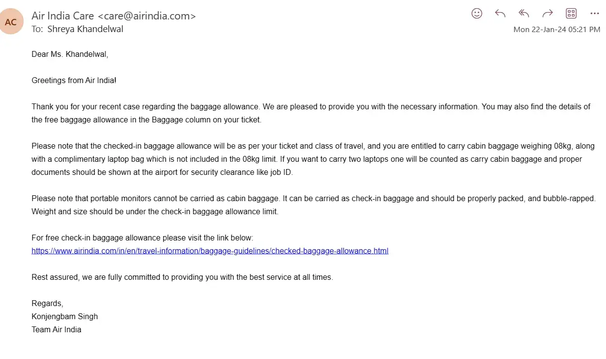 I raised this issue with Air India staff at Bangalore, but they rudely said you should ask Air India Express and not us. This I totally don’t understand as they are same company or related companies and there is absolutely lack of coordination between them