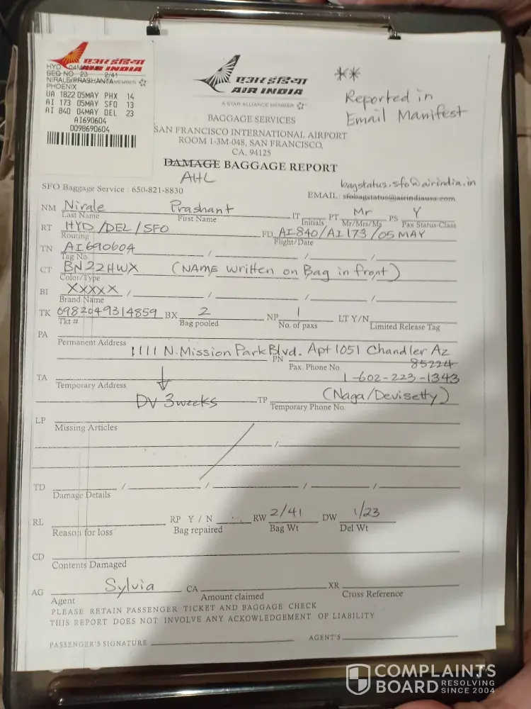 I have not received my checked-in baggage in SFO airport. By baggage ID - AI690604. And ticket number given below. Start date 4th May in Hyderabad AI840 flight.