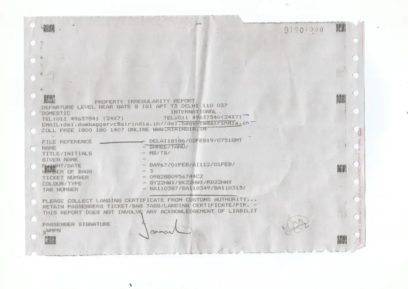 On arrival at Delhi Airport on 2nd Feb 2019, all of her checked baggage comprising of three (03) bags, were missing.