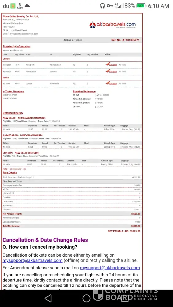 Cancellation of AI9550 on 17th February 2019 - refund of charges - reg.