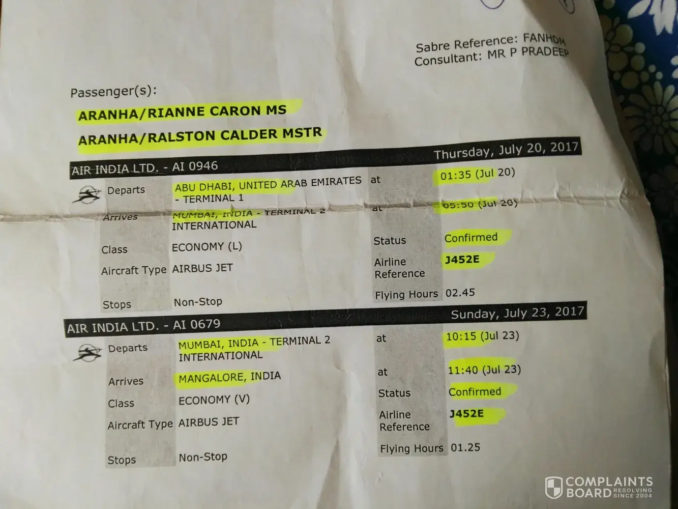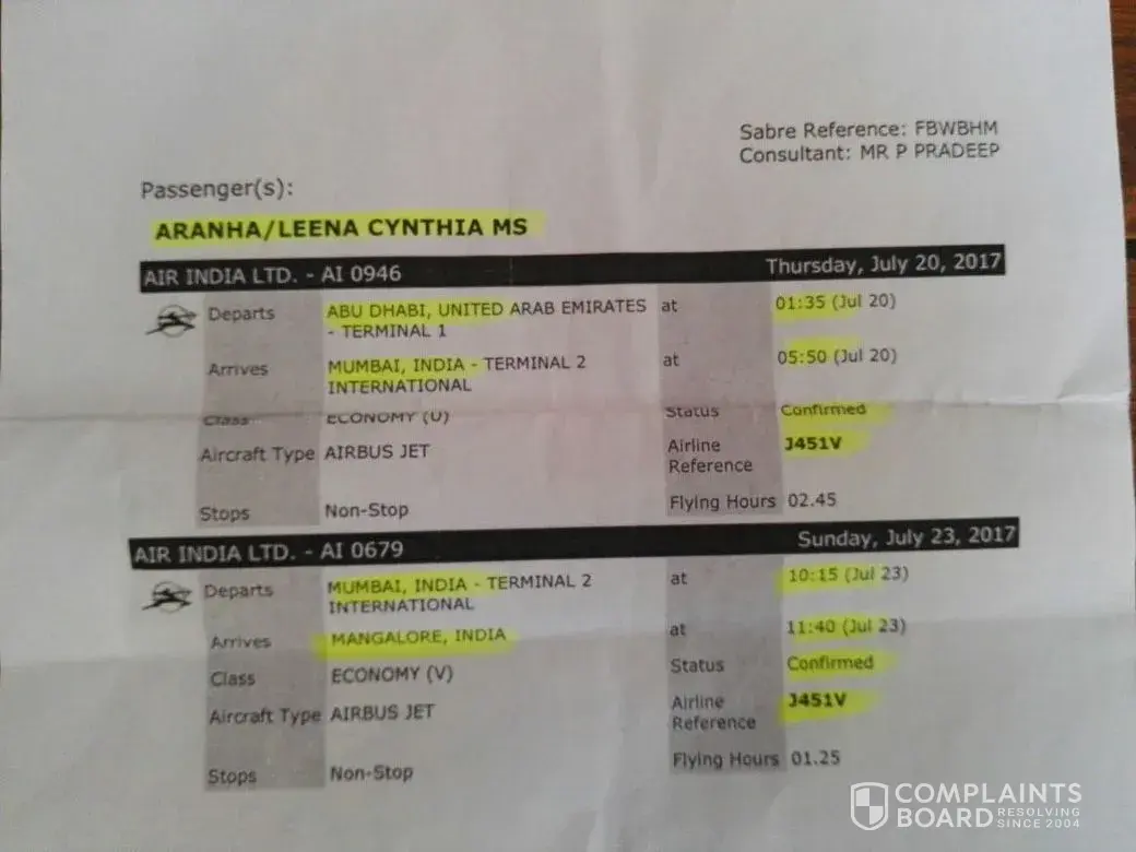 I the undersigned along with my daughter, Rianne and son Ralston were travelling from Abu Dhabi to Mumbai by Air India on 20th July 2017 and from Mumbai to Mangalore on 23rd July (Copies of the E-tickets are enclosed for your ready reference). During my travel I encountered the following difficulties: