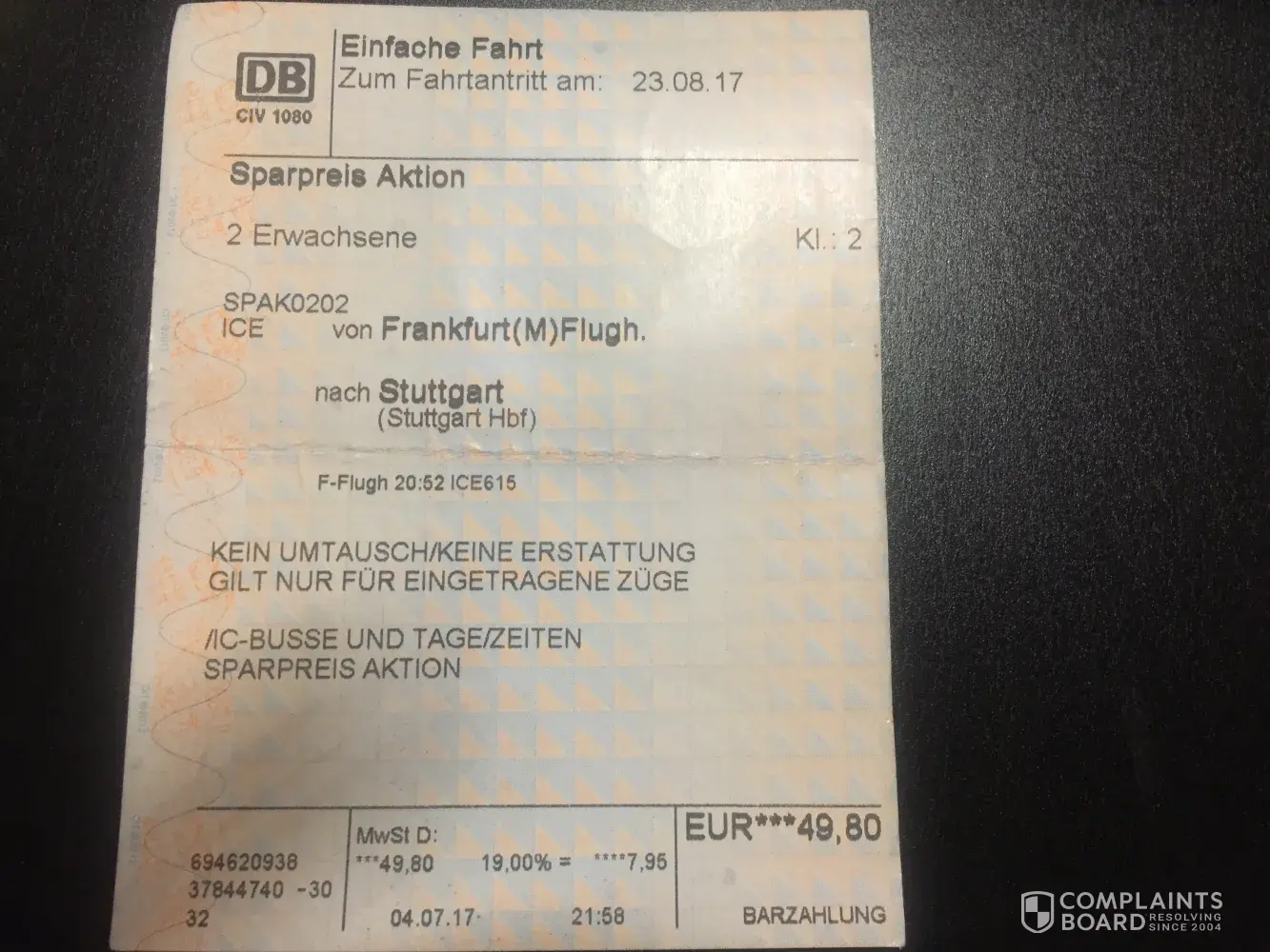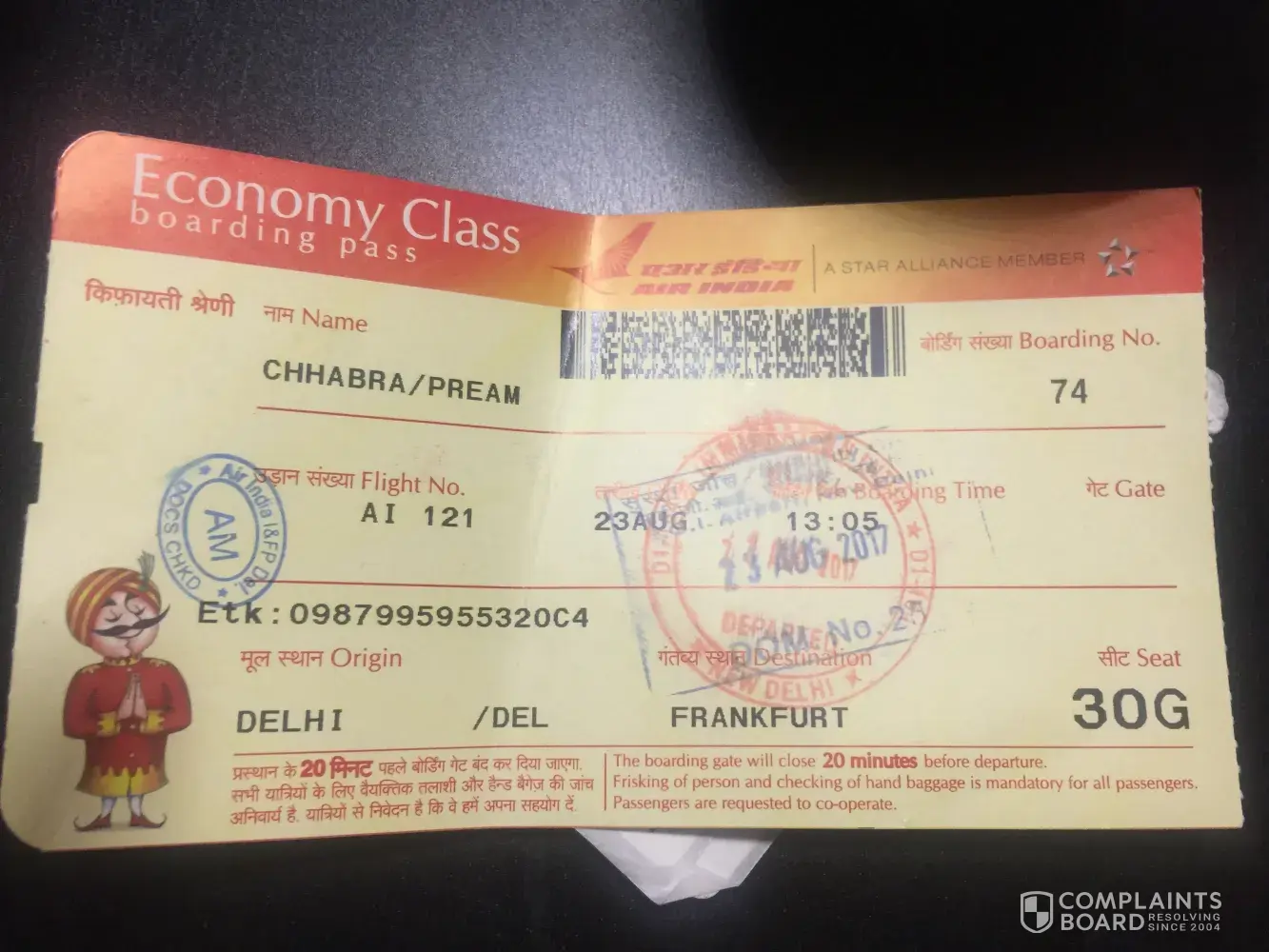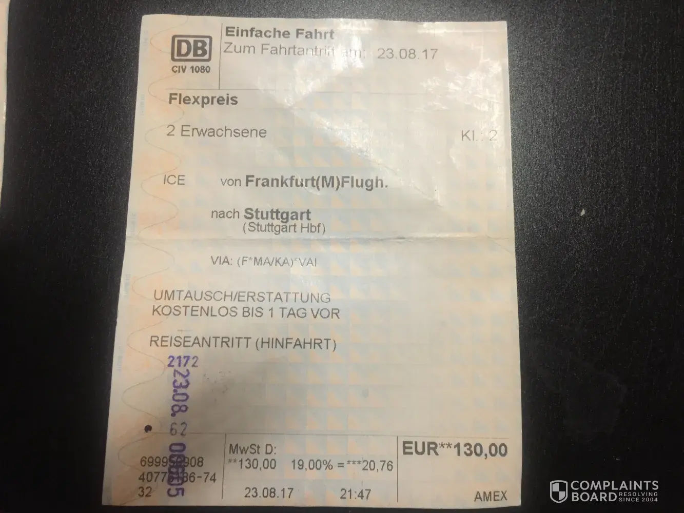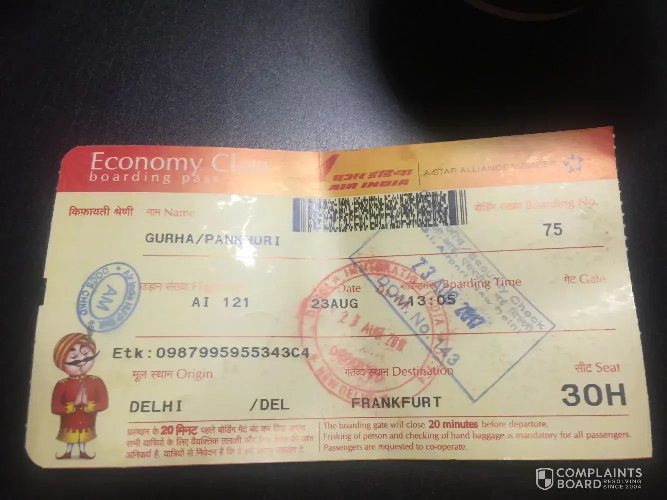 This is in regards to AirIndia flight AI 121 from Delhi to Frankfurt on the 23 August 2017, we boarded the flight and because of some issue the flight departed late from Delhi Airport and it landed late as well in Frankfurt around 07. 38 PM and we went to collect the baggage which was not on the belt we were near the belt around 08.00 PM and because of the aircraft problem we got the luggage at 09.10 PM we went to the Air India counter because we had a train to Stuttgart at 08.52 PM was been missed and the person at the desk did not help us and we have to buy a new ticket to stuttgart which cost us 130 Euro for 2 people.