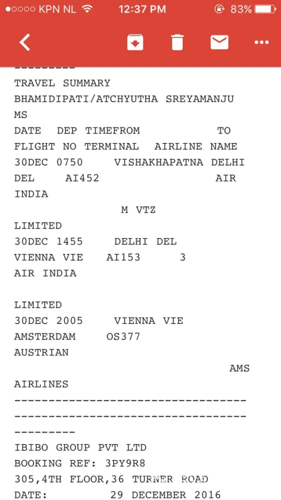 I have travelled from hyd-del-vienna on 1/2/2017.
