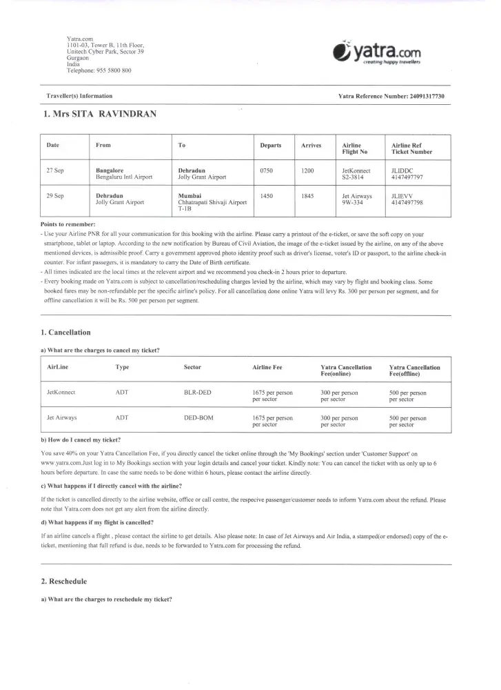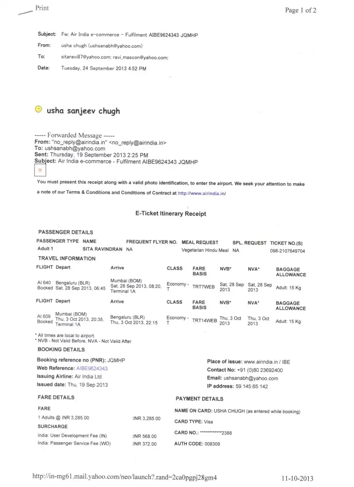 My mail : to: [protected]@airindia.in : Dt: 11 Oct 2013 : Dear Sir, I had booked for my sister Sita Ravindran from BLR TO BOM and Return Through Air India Ticket No: [protected] Reference AIBE9624343 28-sep and 3-oct, She changed her plans flew from BLR-DED-BOM BY JET on 27-sep and returned by AIR India BOM- BLR on 3-oct same Ticket No: [protected] Reference AIBE9624343. I went to cancel at the airport on 27-oct, more than 24 hours before the flight timings, the air-india incharge at the airport counter said he will cancel, but, i should again confirm with e-commerce or unity building bangalore, as otherwise they might cancel the whole ticket, the return of 3-oct too. i again went to the counter on 3-oct after her return but he said the system does not show old details there etc. I want the refund for AI640 BLR TO BOM Ticket no [protected] Reference AIBE9624343 for 28-sep as i have already cancelled on 3.10.13. You may credit to the same account of usha s chugh as it was card payment. Annexing the scanned copy of the tickets. Please do the needful and reply urgently. Thanking you usha s chugh