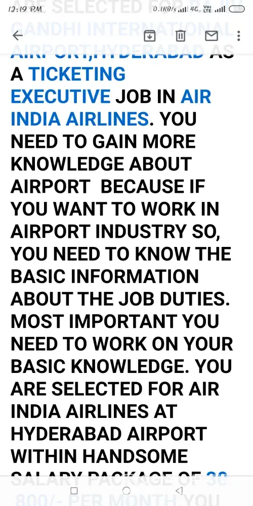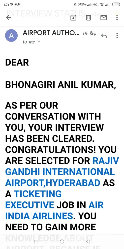 My name is Bhonagiri Anil kumar i had received a message from @jobs updates. names Monika Batra(Senior Hr Manager) mentioning that my job application has been selected in air india for domestic airport, for joining send passport size photo, i'd proof, education certificate and updated resume on Mail id is airportauthrityofindia123zoho.com. When i chatted to this mail he replied me my job post is ticketing excutive at Hyderabad RGI Airport (Shanshabad) and my joining date is October 1st of 2019. There was completed my telephonic interview, i will Got A successfully finished interview. Then air india application @rs.2500 pay till today by online in this ACCOUNT DETAILS/-