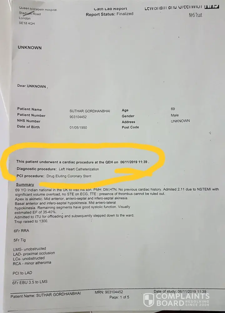 My father Gordhanbhai suthar discherged from the hospital (UK) after the treatment of stent procedure for heart attack on 6/11/2019.