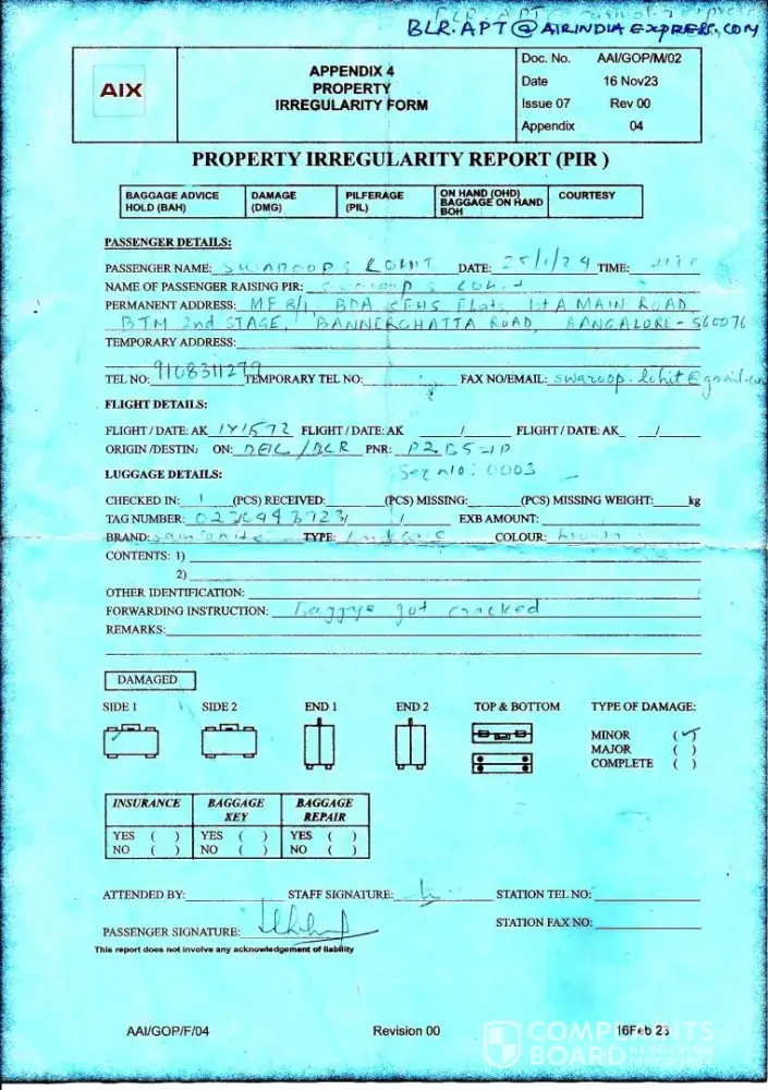 1. I traveled from Delhi to Bengaluru by flight IX1592 on 25th January 2024, PNR-P2B57P, Seat no 29E.(Boarding pass attached with this email) 2. I received my Suitcase in broken condition on arrival at Bangalore T2 terminal. (Photos of the breakage attached) 3. I reported this at the Baggage section of Air India Express and raised a report after physical...