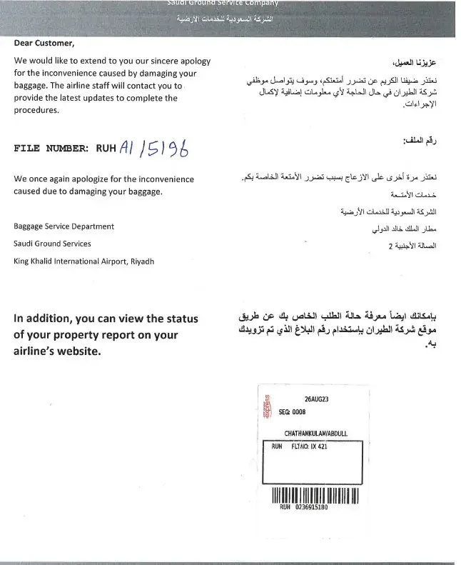And I filed a complaint (AI 15196) in RUH Air Port Baggage Handling Department.