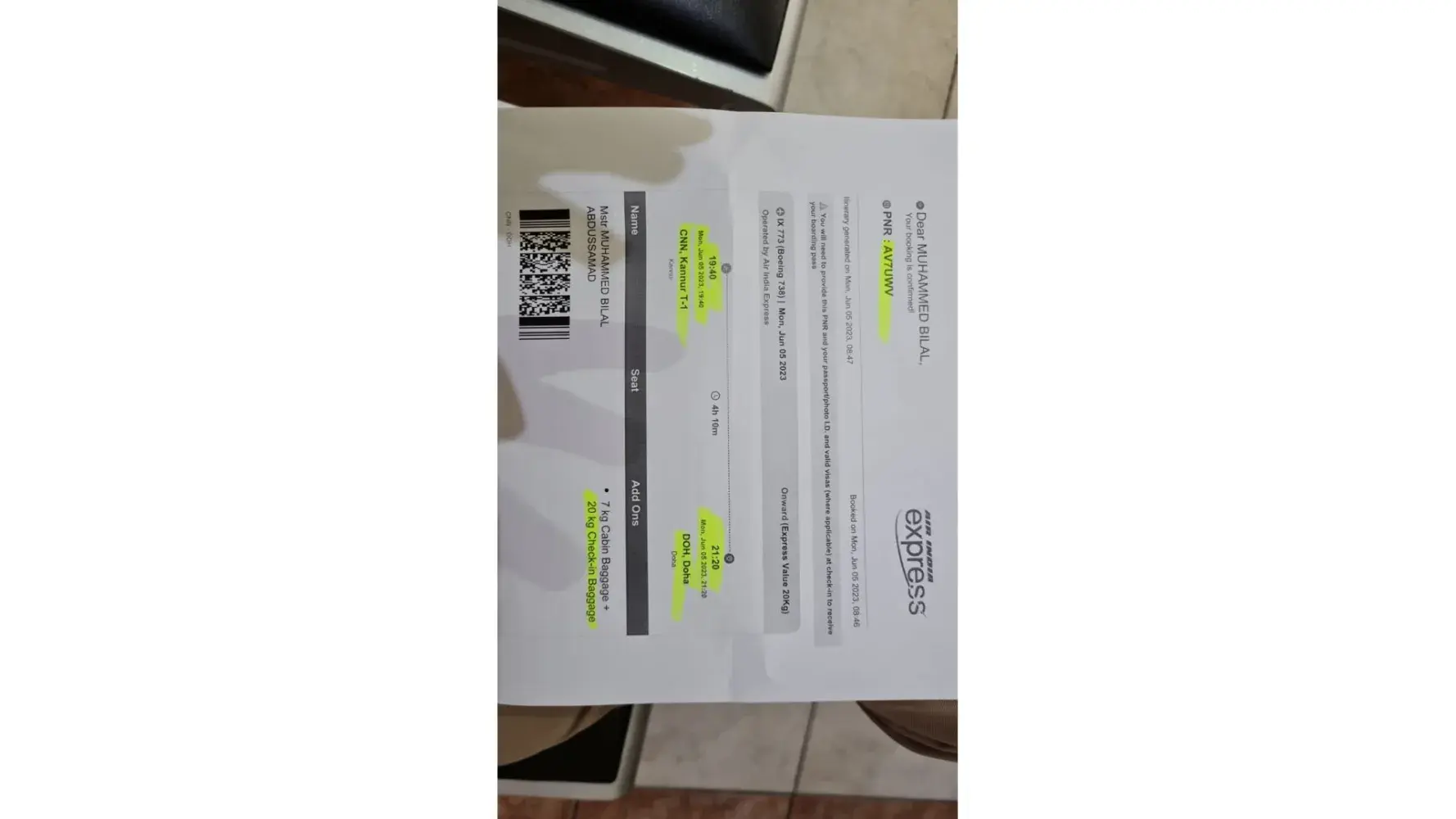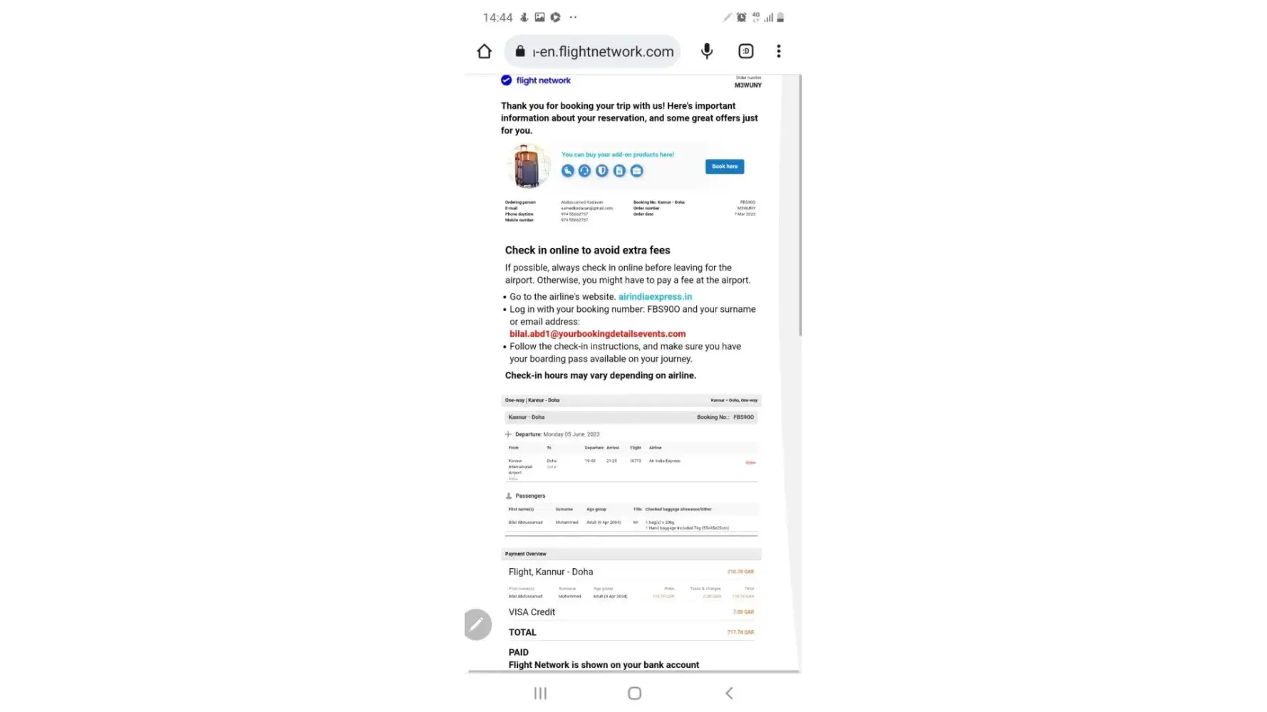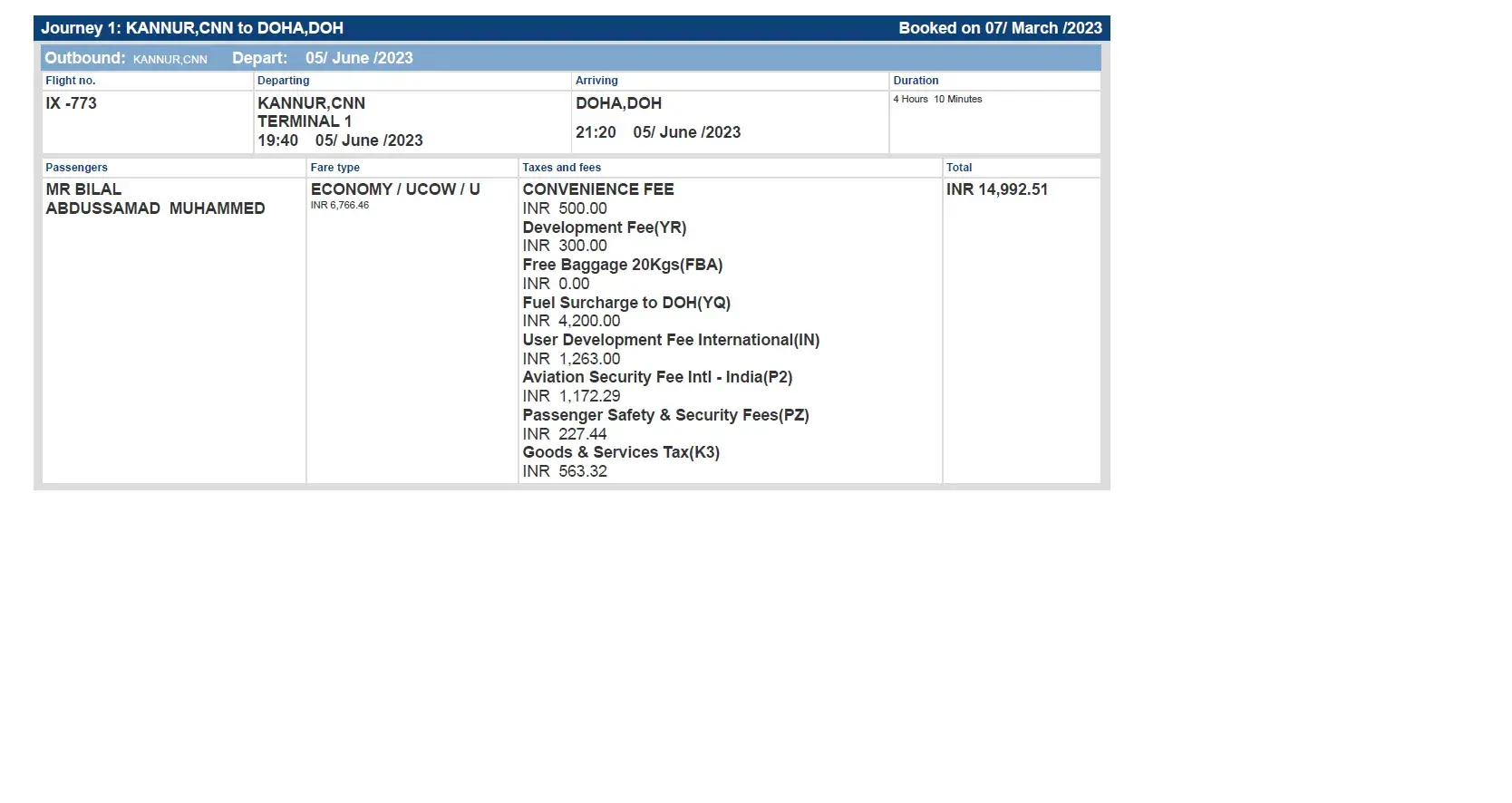 1. Booking confirmed for AirIndia Express ticket for my son Mr. Bilal Abdussamed through Flightnetwork, travelling from CNN to Doha, Qatar (PNR FBS90O), on 05/06/2023.