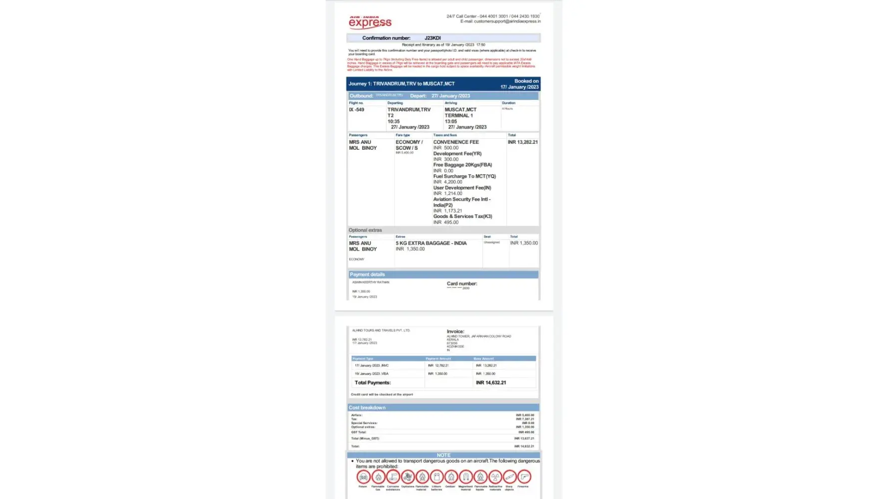 Myself, Anumol Binoy, had booked my flight tickets from TRV TO MCT on 27.01.2023 (flight number - IX - 549. Flight was supposed to departure fron Trivandrum airport at 10.35 am and I had travelled more than 260 kms from my hometown to TRV airport and reached by 7 am in the morning.