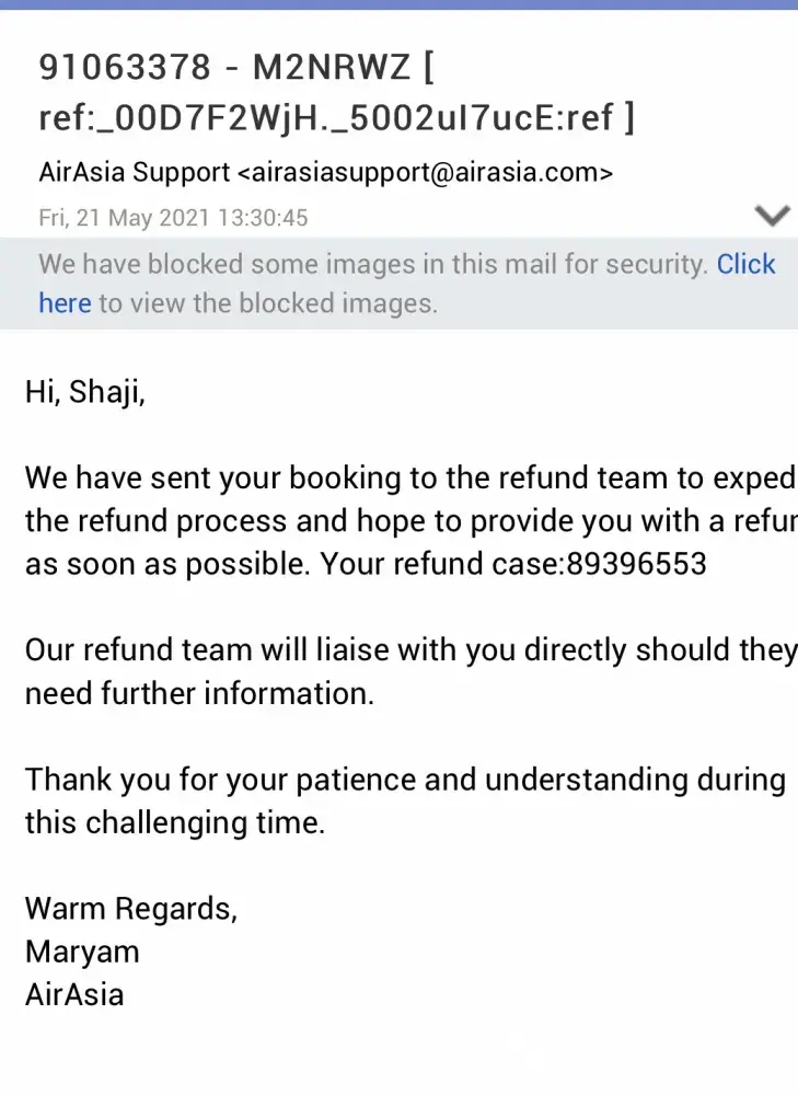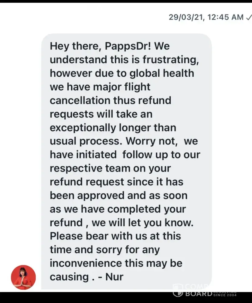 My flight (honeymoon) Seoul to Maldives, through Malaysia was canceled by AirAsia, obviously due to covid. After hours of waiting to chat with AVA associate I was able to finally request a refund to my original form of payment, only to be notified days later that my request was denied. I immediately got back on chat, again waited for hours threatening to file complaints to both my wife's country's authority that oversees such actions, as well as mine. I was told that the customer agent would press management to approve the refund. To my surprise, days later I received the following email: