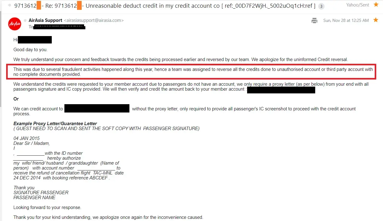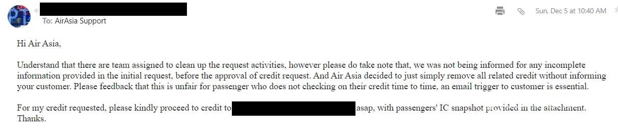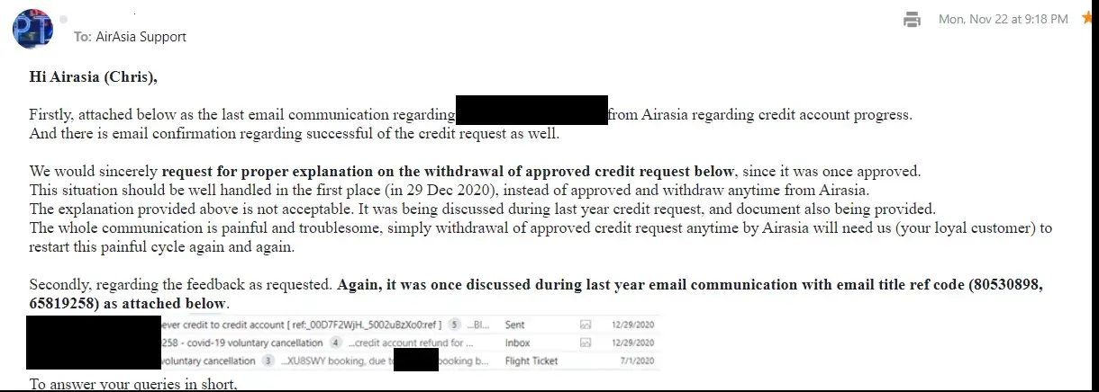(1) their dishonest as Airasia withdraw an approved credit amount after almost 1year, with the reason due to insufficient information provided for validation. However, there are non of email communication regarding the withdrawer of credit, and there are no email trigger to ask for more information before withdraw the credit.