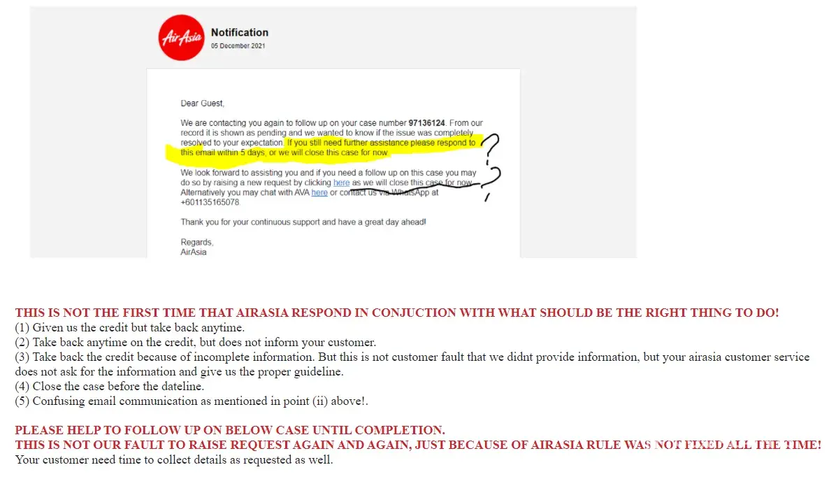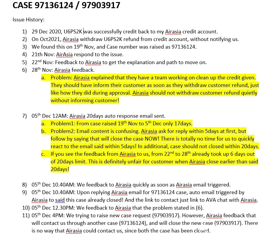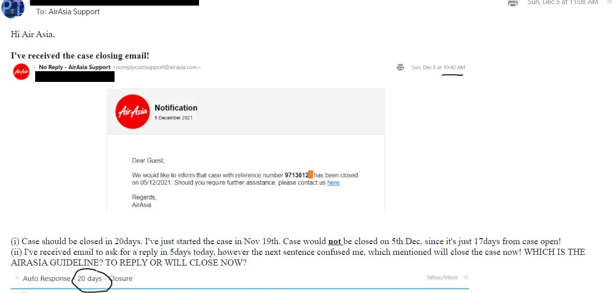 (2) their irresponsibility during handling of case [protected]) for us to get back the credit. I've raised a case to handle this credit request back on 19th Nov 2021, after few email communication, there are auto email triggered on 5th Dec to close my case. Firstly, case should be closed if 20days since case opening, however, from 19th Nov - 5th Dec took only 17days. Case just closed without settlement, and email communication was confusing (ask for reply within 5days but next sentence mentioned will close the case now). There are no reminder for us to respond to the case before the case closed.