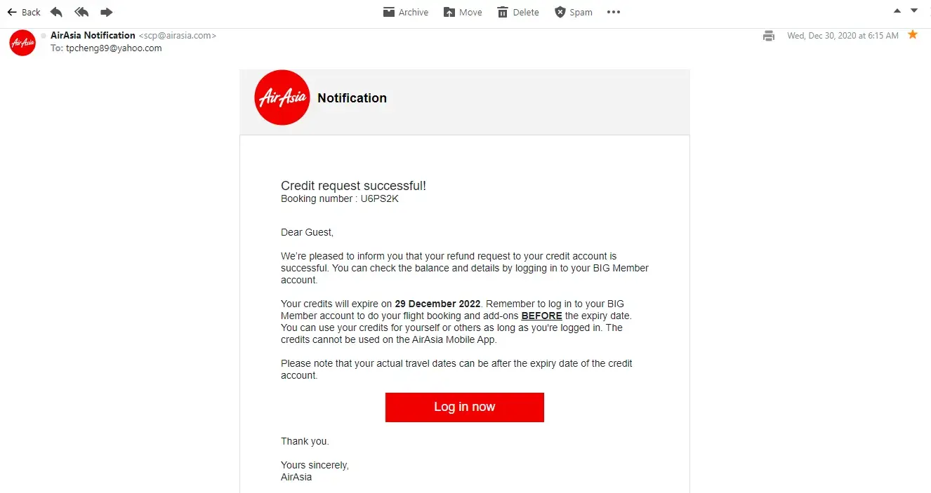 Last year I booked one flight on airasia.com and due to COVID 19 situation may flight has been canceled. Then Airasia refund my money in a credit account and said that I can use this credit account to book other flights within 2 years.