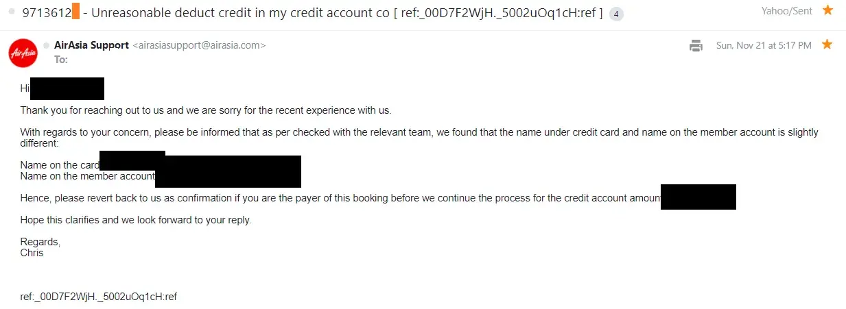 Withdrawing of airasia credit amount without notification and poor follow up on the case