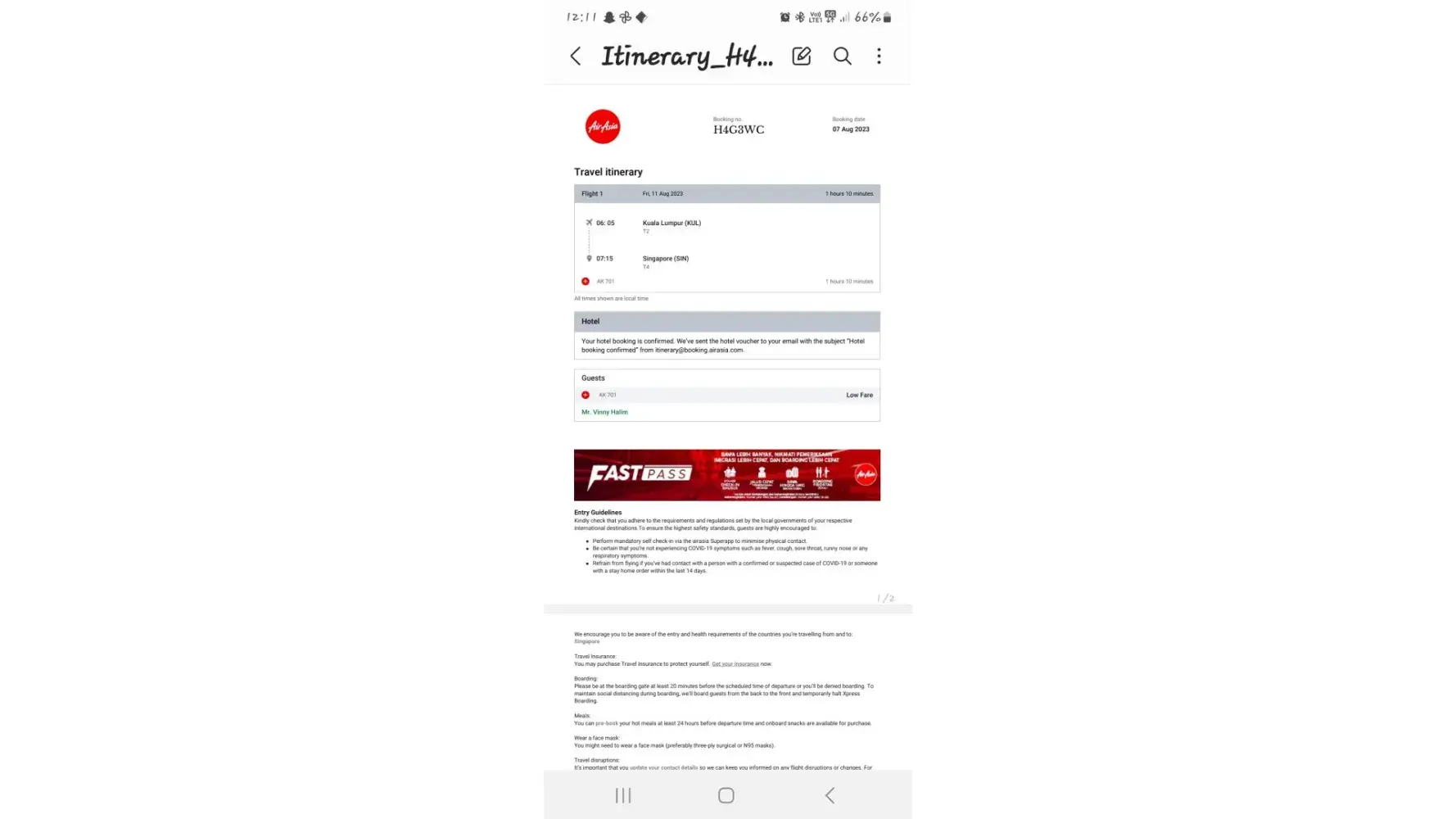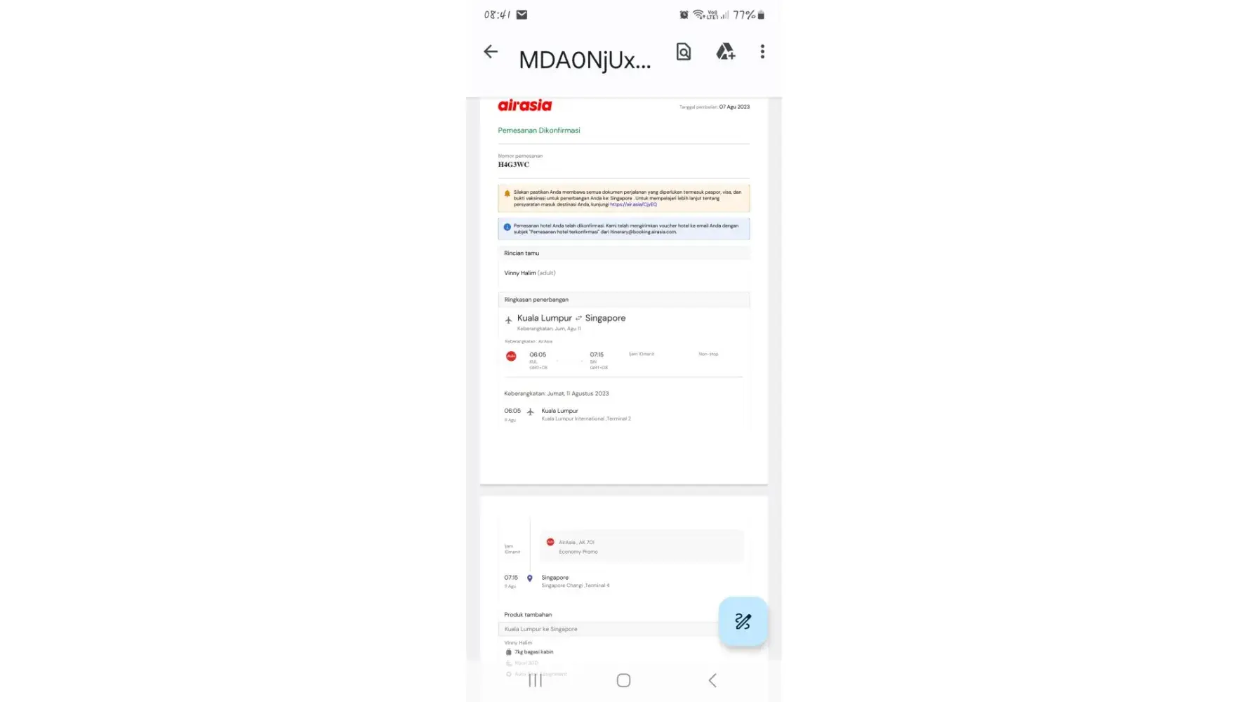 The three documents are attached for your references showing the booking, flight dates and schedule, ticketing agent and payment.