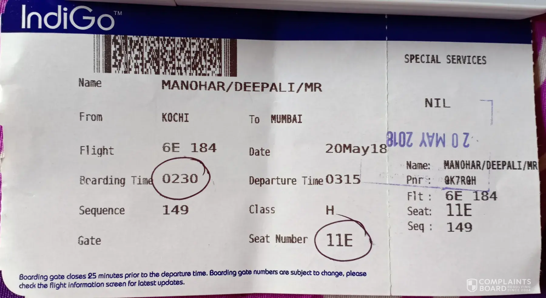 As I missed these flights, I had to purchase new tickets from Kochi to Mumbai. Boarding passes are attached for your reference.