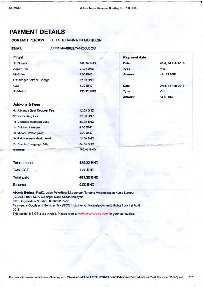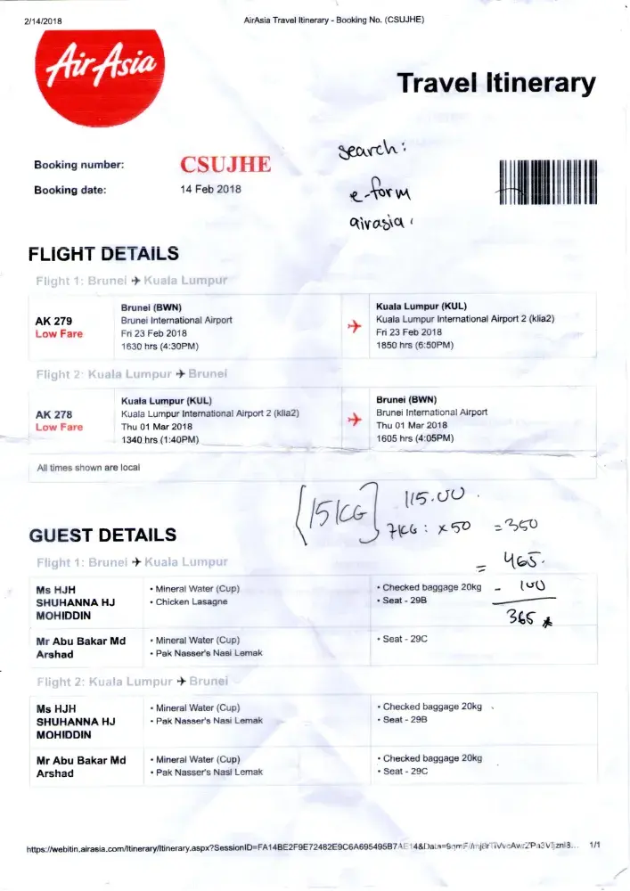 Hari ini flight saya balik dari Kuala Lumpur ke Brunei Darussalam jam 1:40 pm AK278, Seperti biasa kami datang awal untok check-in dan baggage drop. counter (Y) Airasia. sampai disana saya telah dimakluman yang baggage suami saya tidak ada dalam system mereka, padahal saya dah beli tambahan baggage pada 14.2.2018 dan telah diterima dan disahkan melalui email dari airasia dengan itu saya telah print resit pengesahan tersebut. Saya tunjokan kertas yang saya prints yg sah dari email airasia. tapi pegawai airasia cina perempuan, tidak mahu terima, malah dengan keras mengatakan tidak ada dalam system. saya setentunya terkilan sebab saya ada bukti pembelian saya, kenapa tudoh saya buat ubahan dalam tikit, bolehke buat begitu. saya suroh check balik2 mengatakan time saya beli tikit pun ada error dalam system, minta pembayaran balik2, nasib saya check email semasa tu mengatakan semua urusan diterima dan sah.