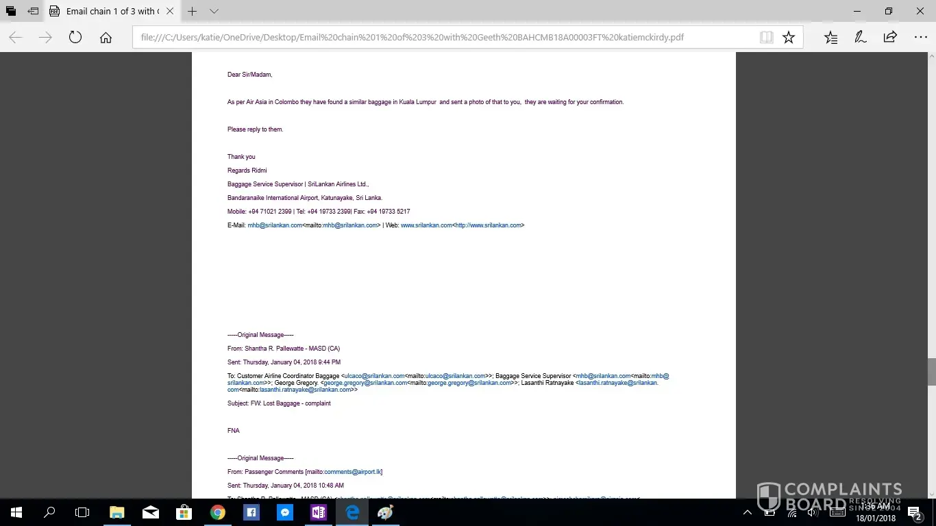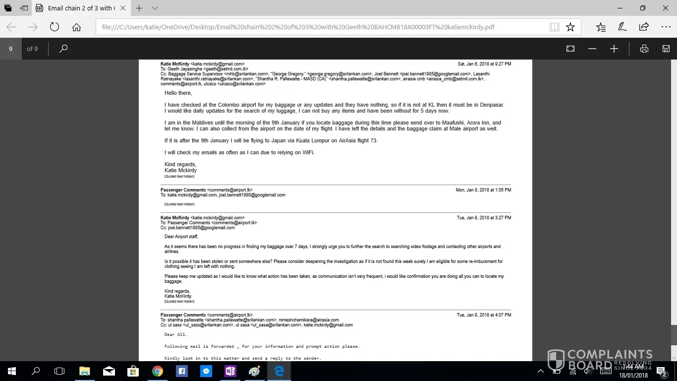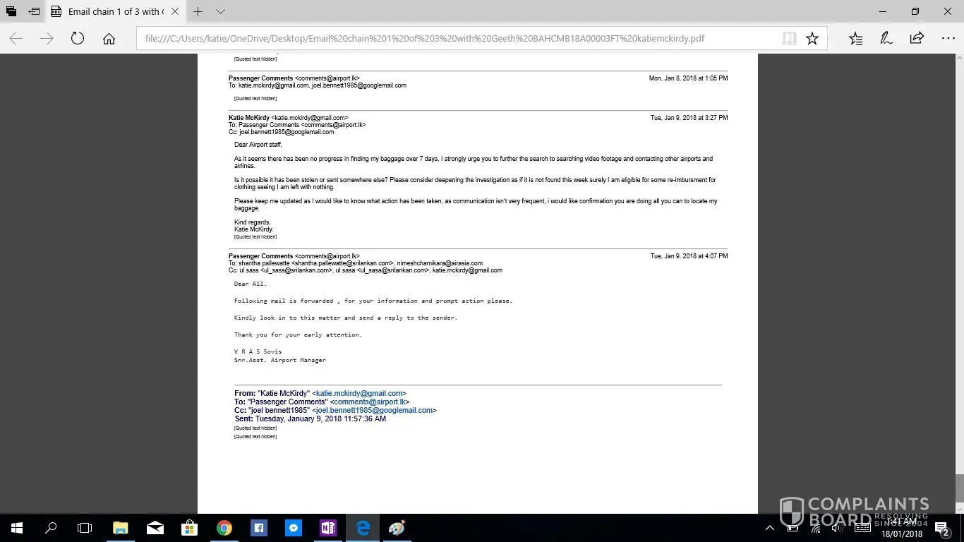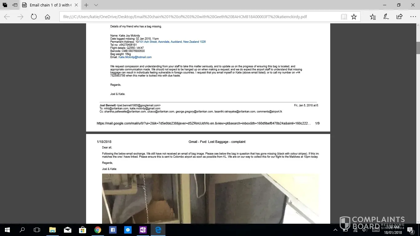 This is the second complaint i have registered, as the first was not acknowledged. If this is not taken seriously or with due haste i will be taking this to the small claims tribunal. I have been contacting Geeth at [protected]@setmail.lk complaint number BAHCMB18A00003FT, i requested repeatedly to be updated daily regarding my baggage search, however this was not done. There for i have had to contact Geeth repeatedly myself, due to lack of information in his emails stating replies such as "sorry for the delay" and "i will get back to you", he had not answered any of my queries, nor get back to me with any information. I would like you to acknowledge the serious impact of this baggage loss, I work as an artist and was relocating from NZ to AUS after my month travels, everything i own is in that bag. I have now lost all of the supplies for my career and been set back considerably. The cost of the items in this luggage far exceeded $4000 NZD. Secondly i was left travelling predominantly Muslim countries with no clothing including underwear and proper coverage. No compassion was given. No understanding was given. I was left feeling very vulerable without any support from your staff until i had to chase for a response. Due to staff saying my baggage would arrive soon i did not buy any other clothing for 12 days then had to out of necessity of travelling to a country in minus degrees.