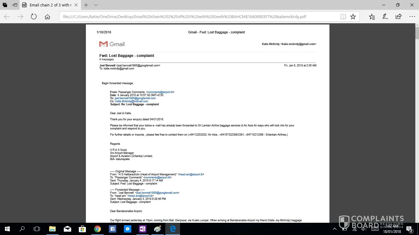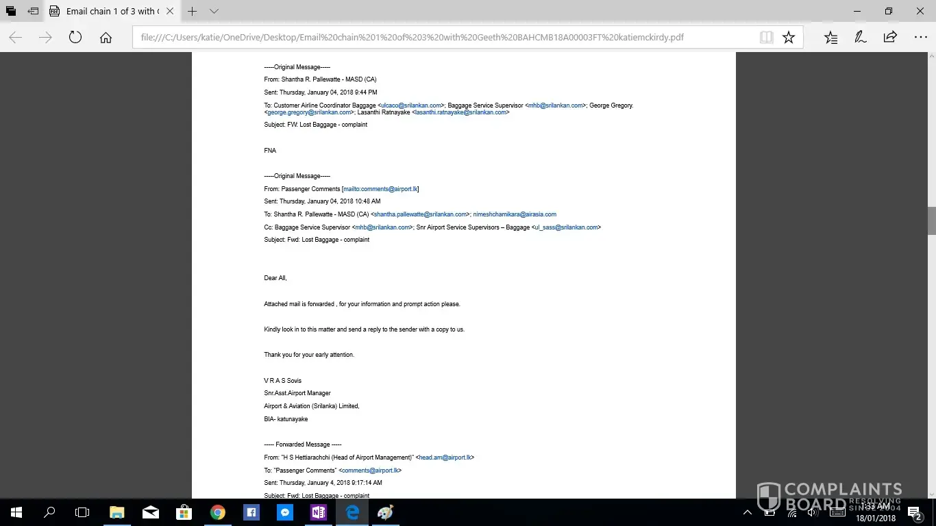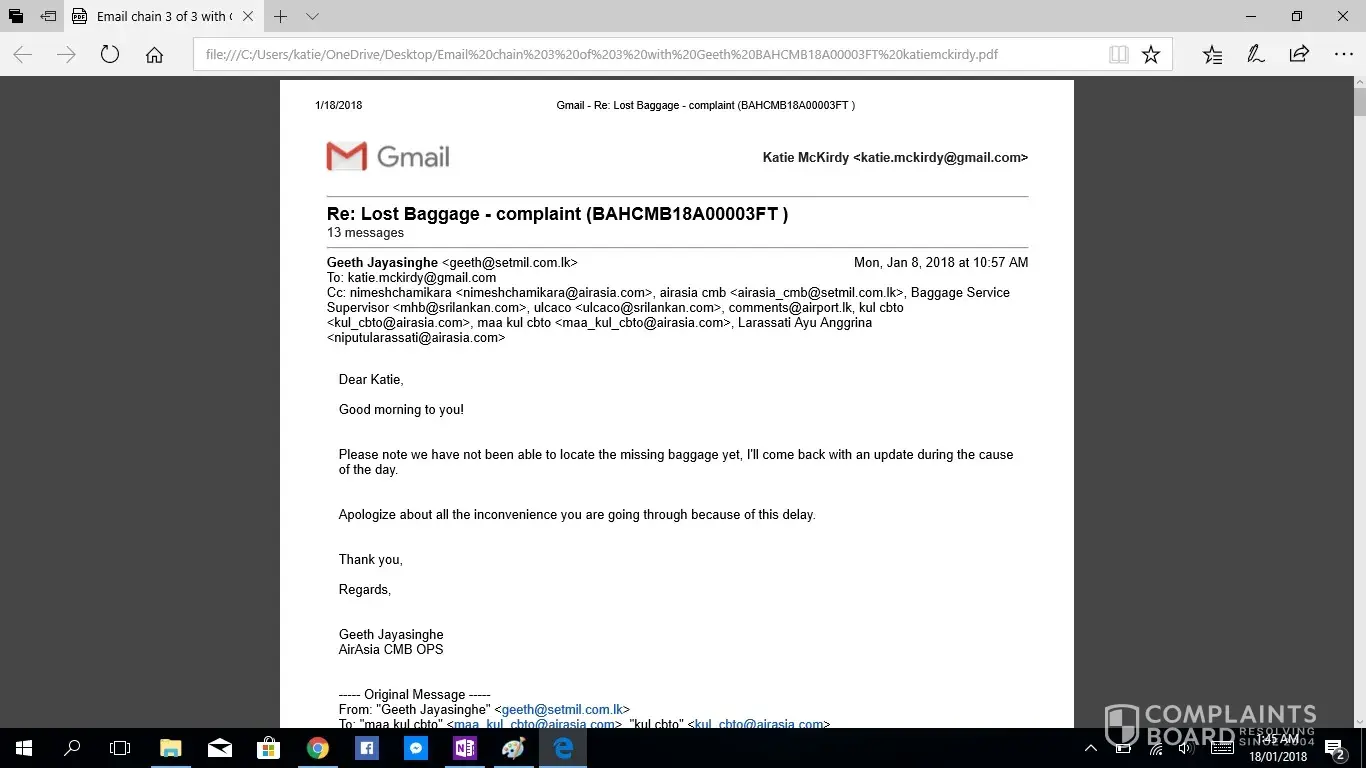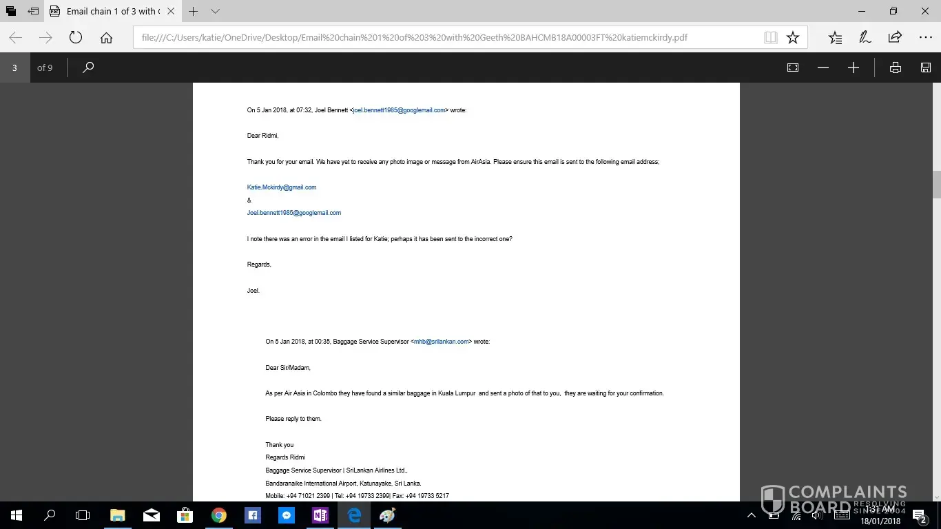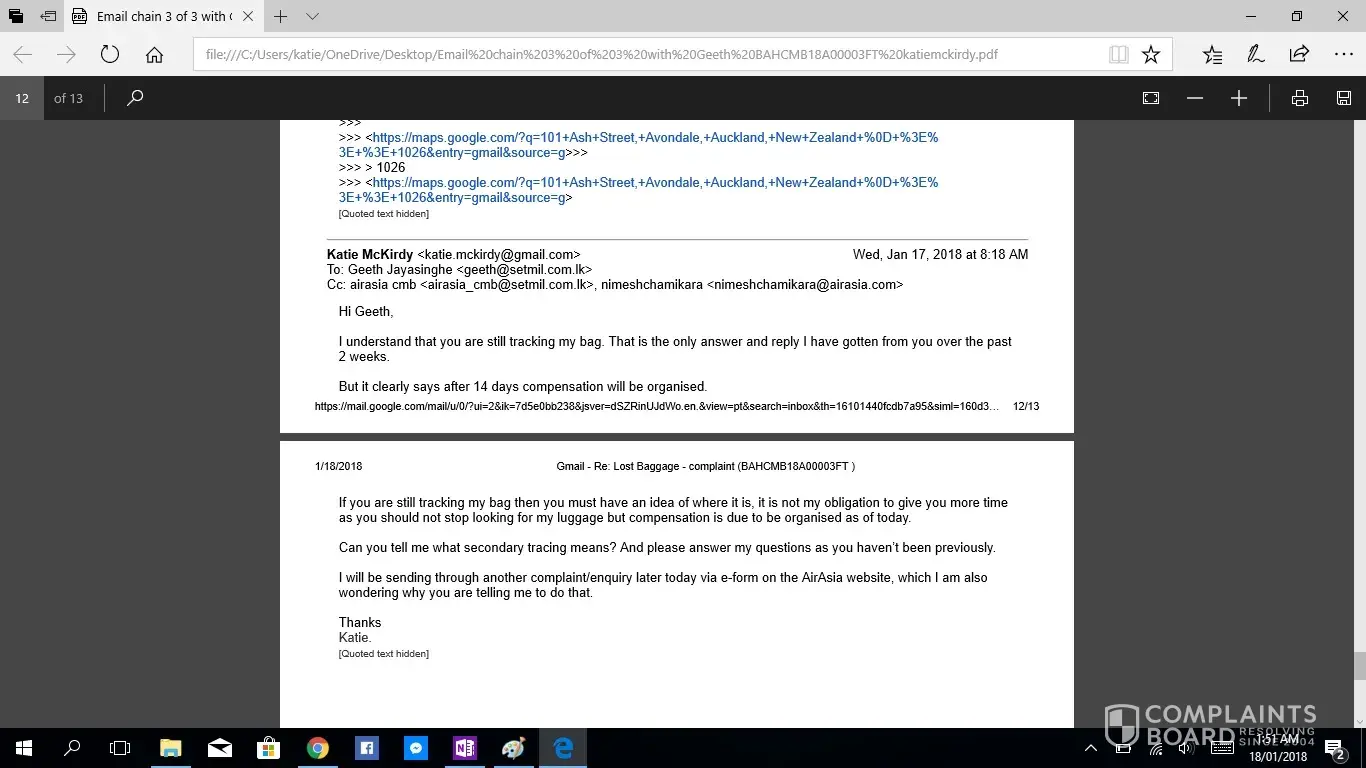 This is the second complaint i have registered, as the first was not acknowledged. If this is not taken seriously or with due haste i will be taking this to the small claims tribunal. I have been contacting Geeth at [protected]@setmail.lk complaint number BAHCMB18A00003FT, i requested repeatedly to be updated daily regarding my baggage search, however this was not done. There for i have had to contact Geeth repeatedly myself, due to lack of information in his emails stating replies such as "sorry for the delay" and "i will get back to you", he had not answered any of my queries, nor get back to me with any information. I would like you to acknowledge the serious impact of this baggage loss, I work as an artist and was relocating from NZ to AUS after my month travels, everything i own is in that bag. I have now lost all of the supplies for my career and been set back considerably. The cost of the items in this luggage far exceeded $4000 NZD. Secondly i was left travelling predominantly Muslim countries with no clothing including underwear and proper coverage. No compassion was given. No understanding was given. I was left feeling very vulerable without any support from your staff until i had to chase for a response. Due to staff saying my baggage would arrive soon i did not buy any other clothing for 12 days then had to out of necessity of travelling to a country in minus degrees.