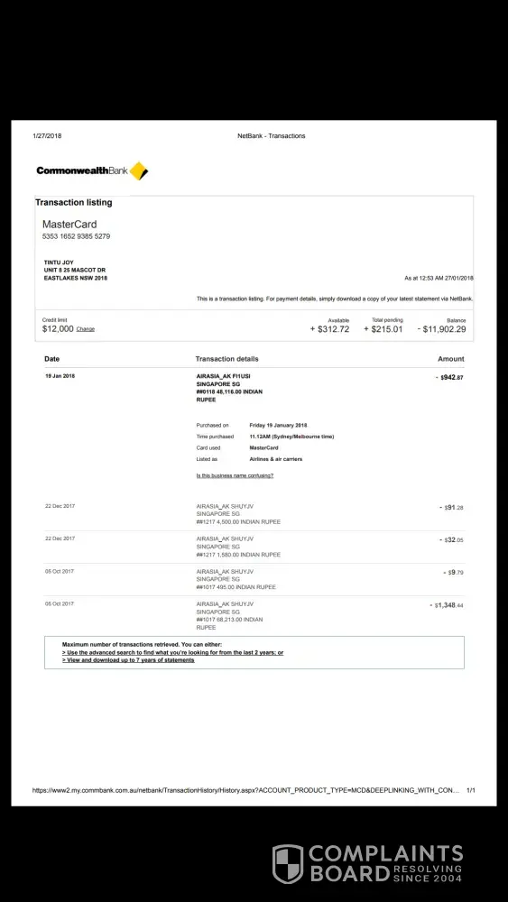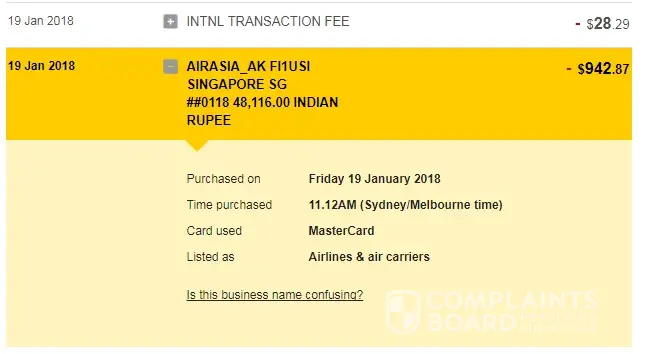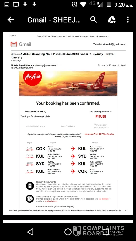 I have a confirmed booking (booking Ref No: FI1USI), from COK-SYD (2 way) on 30JAN2018. I have done this booking online at airasia.com on 19JAN2018. I have received booking confirmation mail (attached) right away the payment from my MasterCard (Credit card issued by CommBank Australia) got confirmed. The amount AUD.942.87 + transaction fee AUD.28.29 deducted from my account that time itself. And of course, I have authorized the transaction through online banking at the same time.