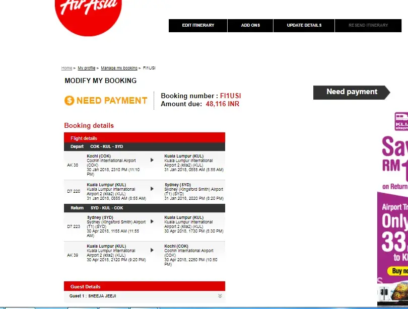 Later, I wanted to modify my booking, to add baggage and meals. When I logged into AirAsia portal yesterday (26JAN2018) to do this, I surprised (or even shocked) to see that my booking status shows "NEED PAYMENT". Immediately I contacted your live chat team. To my utter frustration, they are saying the payment rejected due to some authentication failure and they will refund within 14 to 30 days. They don't have any details why this happened. Then I called customer support. The response was not different! I need to do another payment either at airport check-in counter or through online!