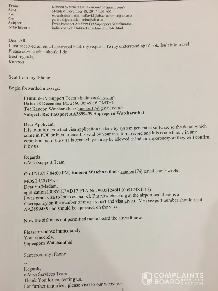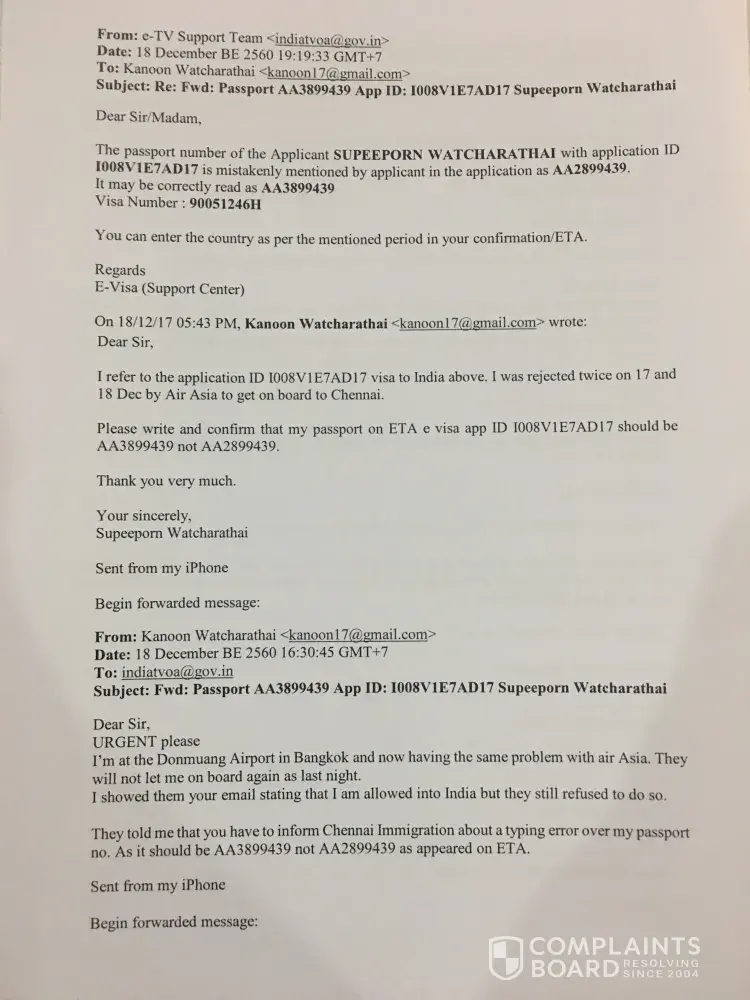I went to Donmuang Airport the following night 28/12/2017 around 3.30 pm, I was met with s staff called Wi Wi and explained what had happened and handed the documents from Visa Authority. To my astonishment and surprised in her attitude, wording, and expression, she acted as she didn't believe the source of the email and told me no official stamp on the email so I told her she's insulting Visa Authority I didn't think she understood what electronic mail is? I asked her to look at an email address [protected]@gov.in should be adequate. I told her to talk to Visa officer in India to clarify the problem but she refused. She disappeared and came back after a long wait and when she returned and insisted on refusal me on board. So I asked if I could talk to that immigration person she said she talked to in Chennai what she admitted later it wasn't immigration she talked to but it was a staff in Chennai.