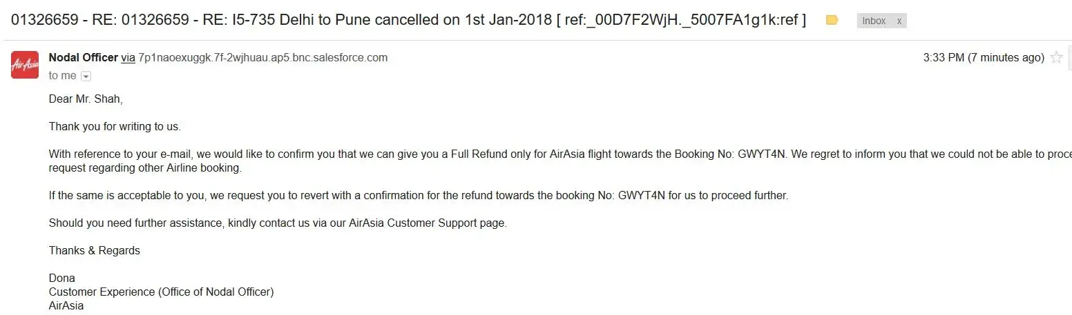 - Full refund for my cancelled Air Asia flight(I5-735)[Rs. 5361/-]