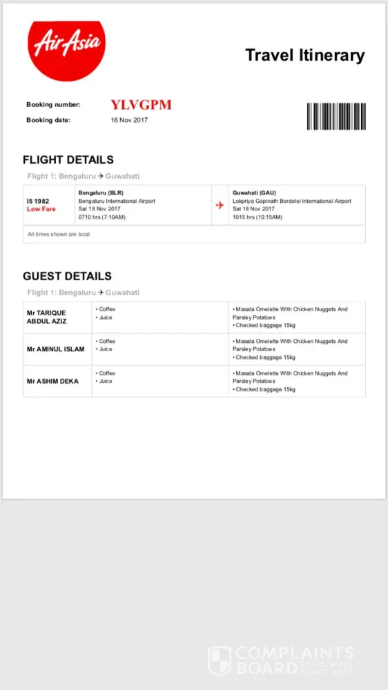 2nd incident: on 16th November 2017 i called my uncle who works in travel agency to book tickets for 3 of us for 18th november 2017. Before he sent me the tickets on my phone, i got a call from AirAsia that there is no meals added on my booking and whether i would like to add the same. I was asked to pay the amount during my boarding time. I agreed. But later when my uncle sent me the tickets there were meals already added. I tried to call the customer care and talk about it but couldn't connect. On 18th before collecting our boarding pass we were asked to pay the amount even after showing the staff that meals were already added to my bookings. The staff refused to give us our boarding pass if we dont pay the amount. So finally i paid.
