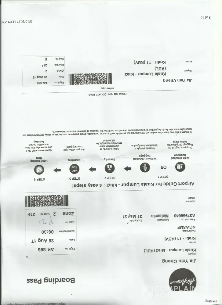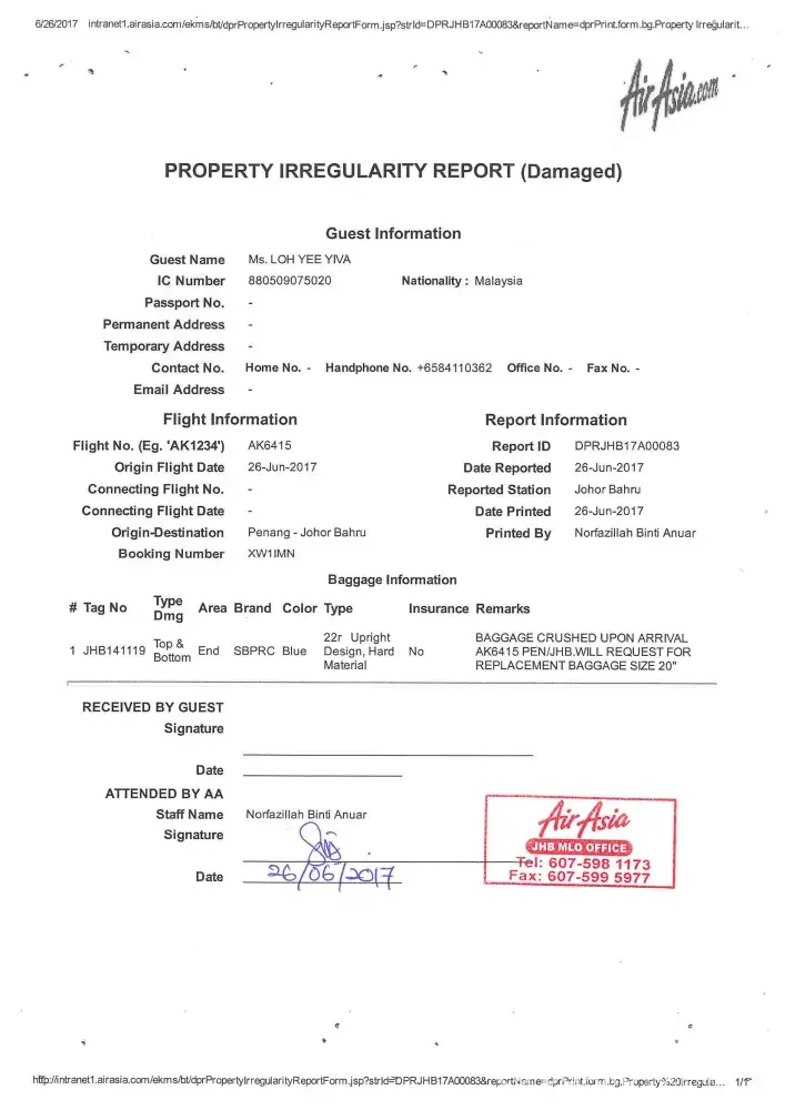 Attached herewith the report I lodged with the Johor Air Asia Officer with the flight ticket.