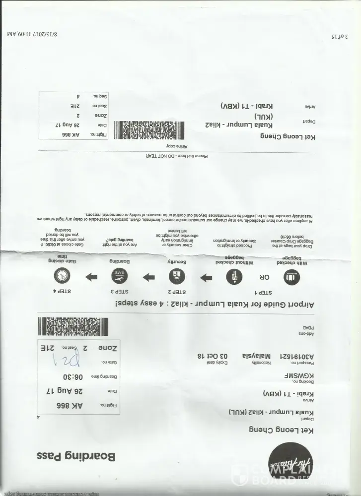 The date is exactly 09 Aug 17 and flight nom is AK 6318, departure time is 4:30pm.