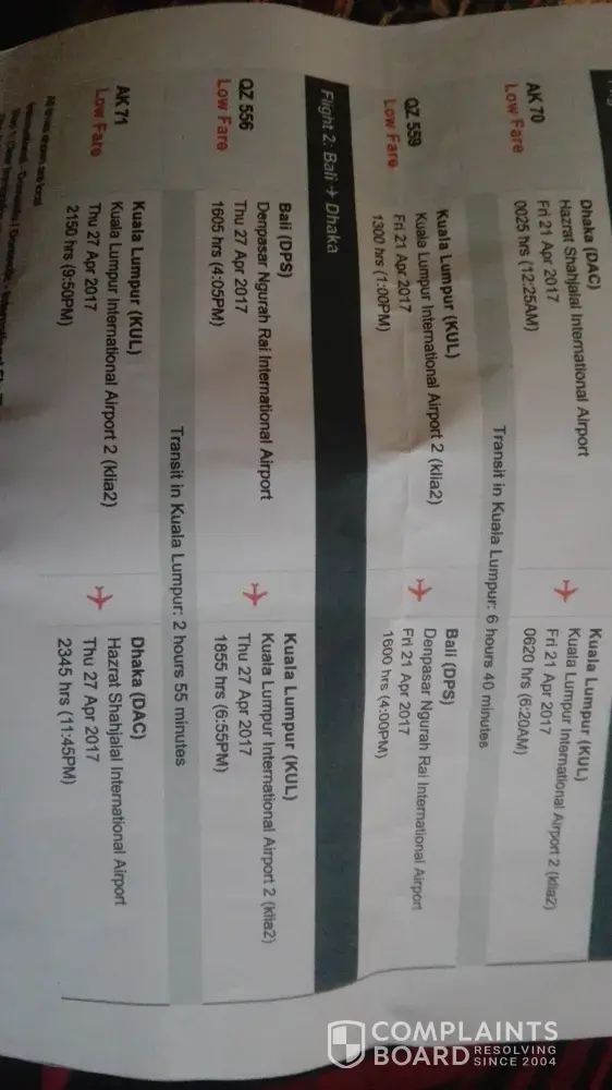 I had a flight on 27th April 2017 from bali to kuala Lumpur at 4.05pm.the flight got delayed for two hours.then it unnecessarily got delayed one more hour.my connecting flight was at 9.50pm from kuala Lumpur to dhaka.our flight landed kul at 10.30pm so I missed my connecting flight.then I went to transfer desk.they told me that I have to wait 24 hours for my next flight.they didn't provide me any accommodation.at first they made a promise but they didn't keep their promise and also misbehaved.this was my first and last journey with airasia.this is the worst airlines ever.