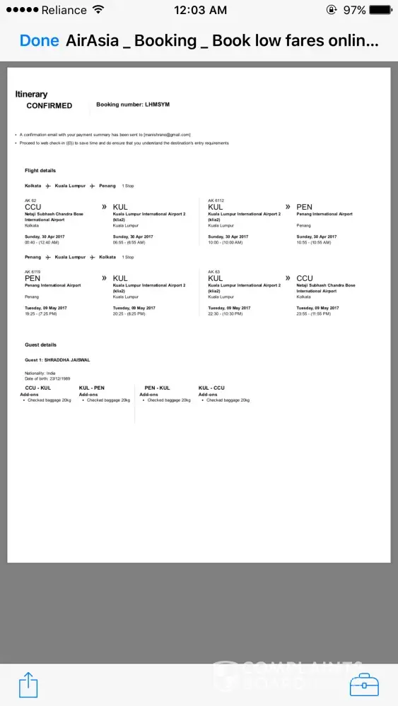 My flight was on 30th april 2017.. flight number AK-62 from kolkata to penang at 12:40 am with booking number LHMSYM..