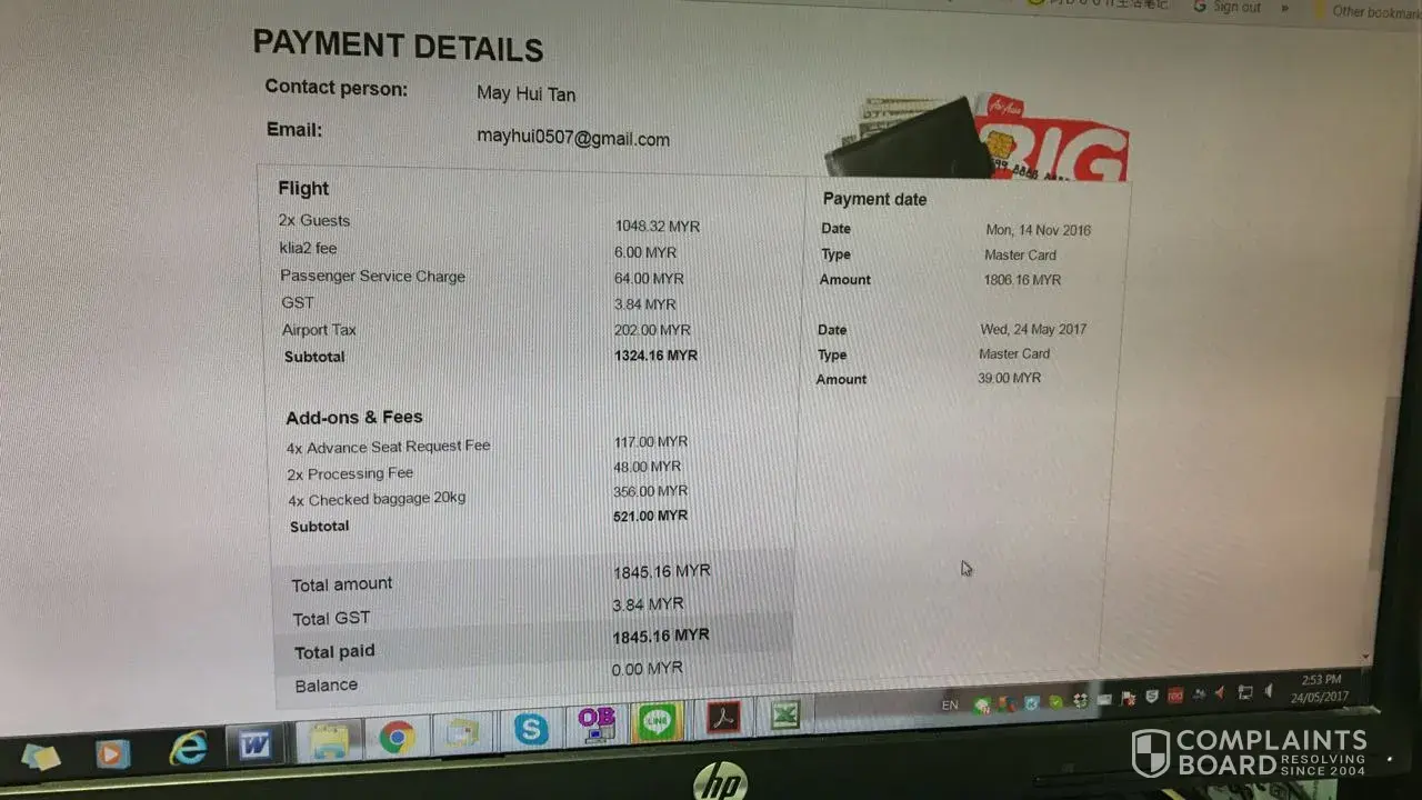 flight booking no: MJ29UA, flight no: AK 131 from Hong Kong to Malaysia on 22 July 2016.