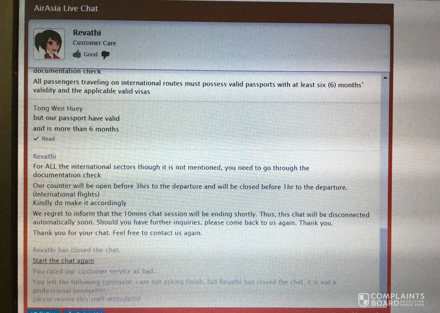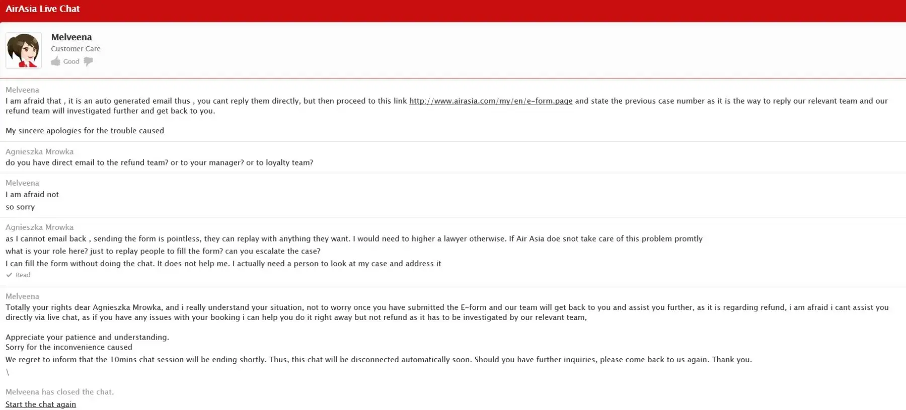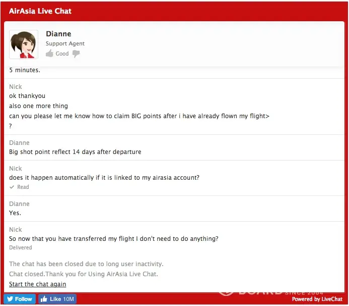 The second time I contacted someone the chat was closed due to "long user inactivity". However this "inactivity" was from the AirAsia Customer Care team. I am still confused about exactly how to claim my points and figure my time is better spent complaining about the lack of Customer Service from this airline rather than being rejected again.