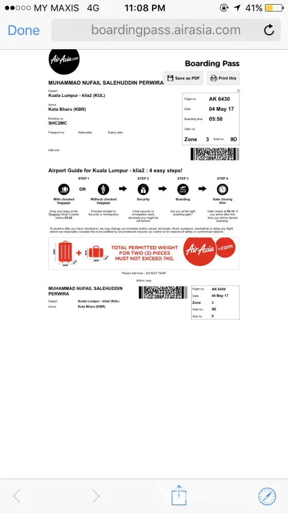 Saya telah check in kan untuk adik saya melalui web check in pada 28/4/2017, booking number shc2mc. Dan print bording pass padanya.
