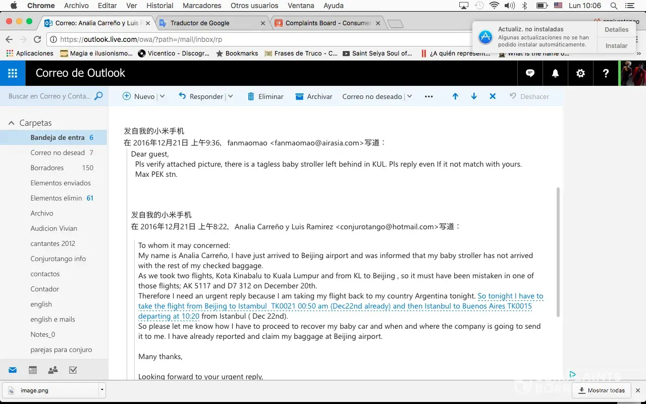 On December 20th, I took a flight from KK to Beijing, with a connecting flight in KL. My baby stroller was left behind in KL airport, and was not send on time to Beijing, as I have (16 hours after my arrival to BJ) my flight back to Buenos Aires with Turkish Airlines. Finally, it was delivered to Buenos Aires via DHL but instead of being paid by the sender Air Asia, as it was the company's mistake, they pretended to charge me an amount of money for it.