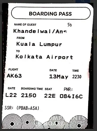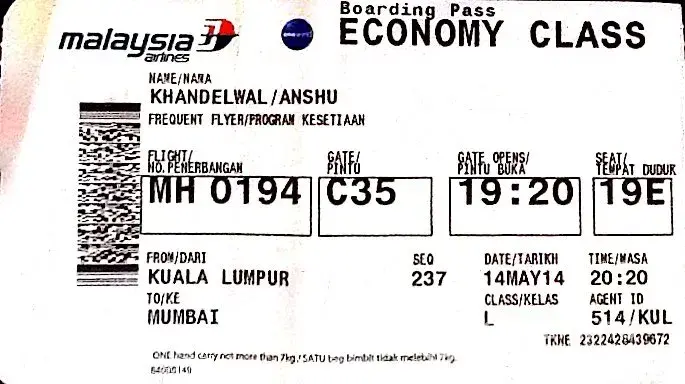 6. Malaysian airline new on counter ticket to India on 14th May (Boarding pass attached