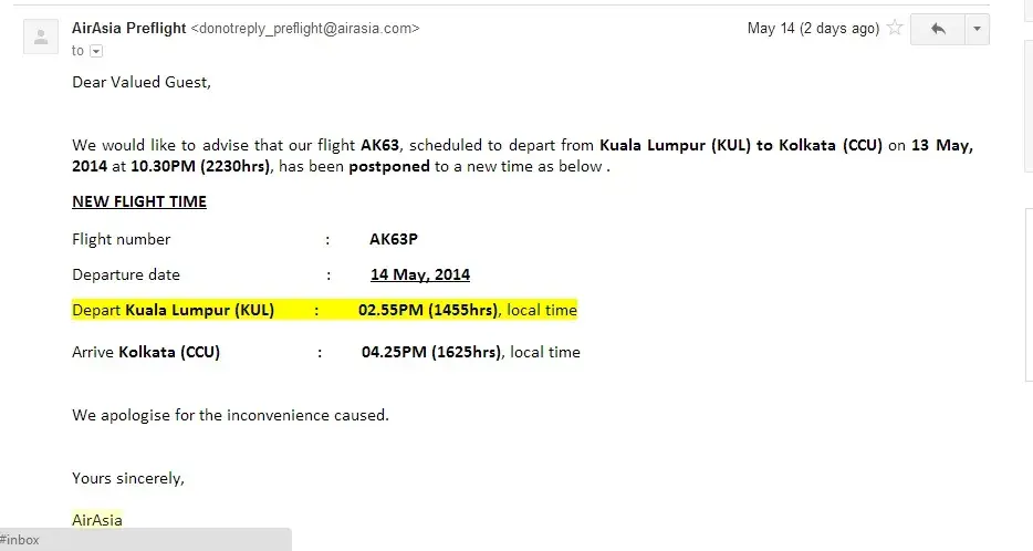 I was supposed to fly from Kuala Lumpur to Kolkata on 13th May 2014, on flight number AK63.