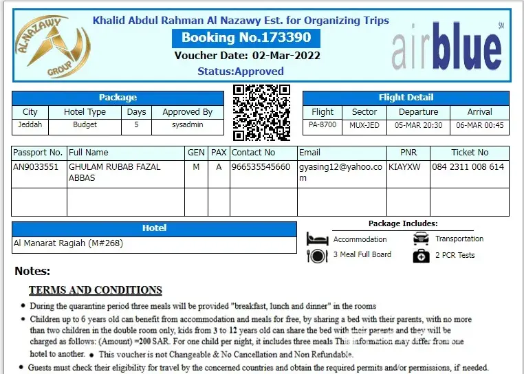 Team, Please be informed you that I booked flights and quarantine package with airblue airline for my family and they reached in jedda International Airport midnight 06-03-2022 When they immigration process completed they come outside they didn't found quarantine team due to government policy changed regarding quarantine they waited more then 3 hours after that I picked up by my self from Airport I requested to airblue quarantine team Please check with hotel team to refund my quarantine amount because my family suffered and didn't get services from the quarantine team there was package for my family for quarantine for 5 days + PCR test Plus transportation services there 2 passport I paid amount 1580 SAR but now they're making excuses searching new new excuses actually they didn't give services and they don't want refund my quarantine package amount which is against Saudi government low (article/617854), dear team kindly check my concern and force to airblue quarantine team to refund my amount 1580 SAR because they're ignoring my request as per Saudi government low all airline should refund quarantine package amount who landed after 5 march this flight laded 06-03-2022 and quarantine package is star from 06-03-2022 it mean airline should refund quarantine package amount all airline should follow the article/617854 because airblue is under CAA and GACA so kindly force the airblue airline let airblue airline force to the hotel for refund my quarantine amount Please check attached for proofs.